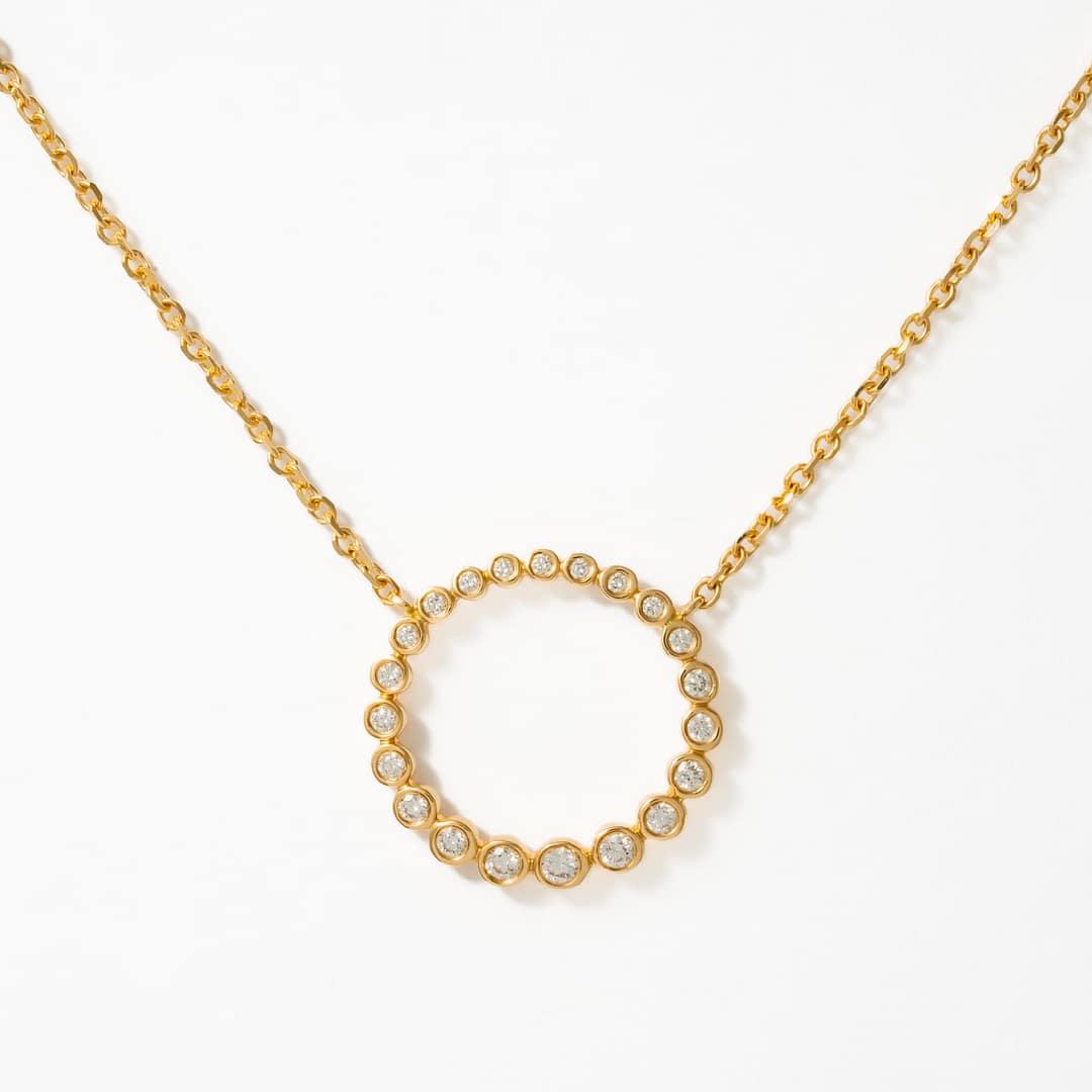 This elegant 18K yellow gold Nutmeg pendant features a circle motif with 21 round bezel-set diamonds totaling 0.28 carats. The diamonds, with a color grade of H-I and clarity of VS/SI1, offer a stunning sparkle. Hanging from a 16″ chain, this pendant radiates both luxury and everyday elegance. Its delicate design and brilliant diamonds make it an ideal piece to elevate both casual and formal looks.