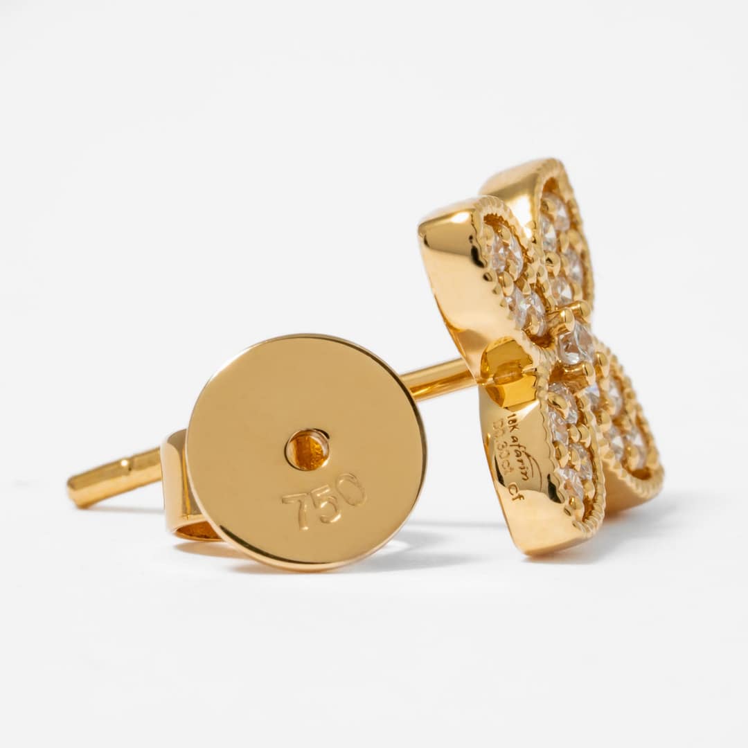 These 18 karat yellow gold earrings present a charming clover design, a classic symbol of luck, finished with an intricate milgrain detail that adds a touch of vintage elegance. Encrusted with pavé round diamonds totaling 0.30 carats, they glint with every movement, capturing the essence of sophistication. The milgrain edging frames the sparkling diamonds, enhancing the texture and depth of the earrings. These clover earrings are a perfect blend of traditional motifs and contemporary style, making them an ideal accessory for various occasions.
