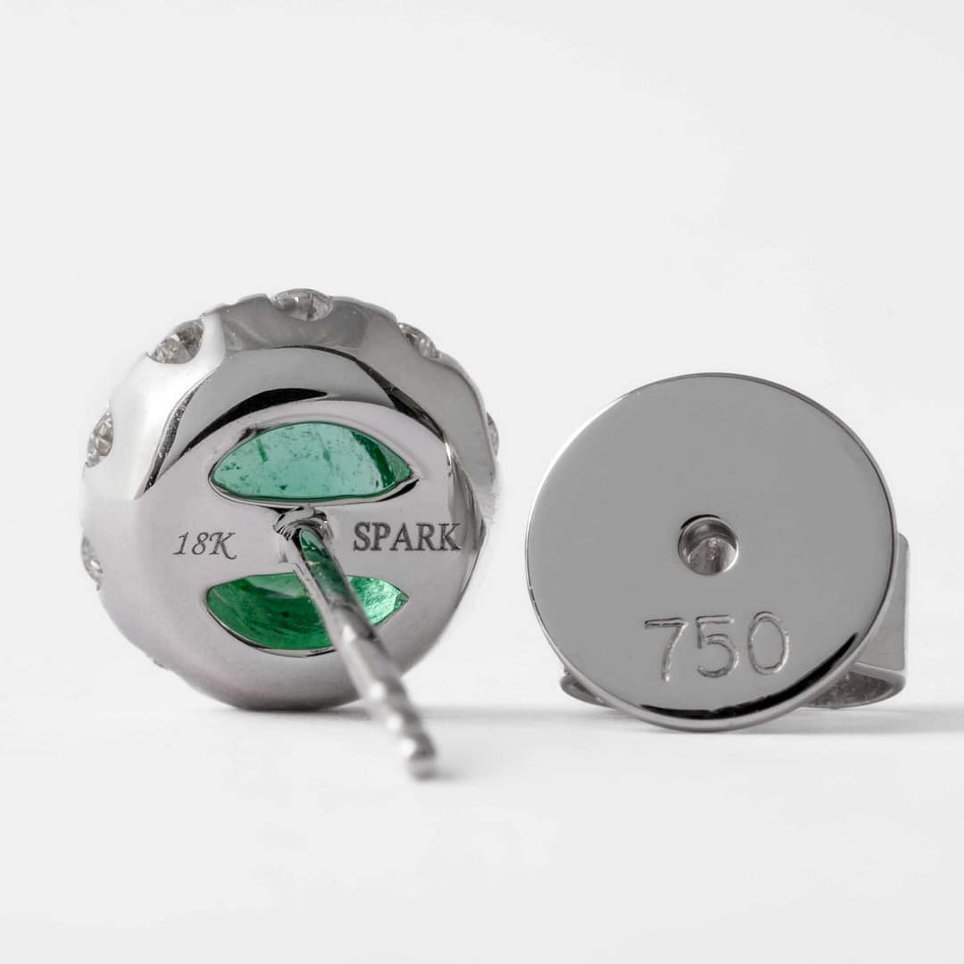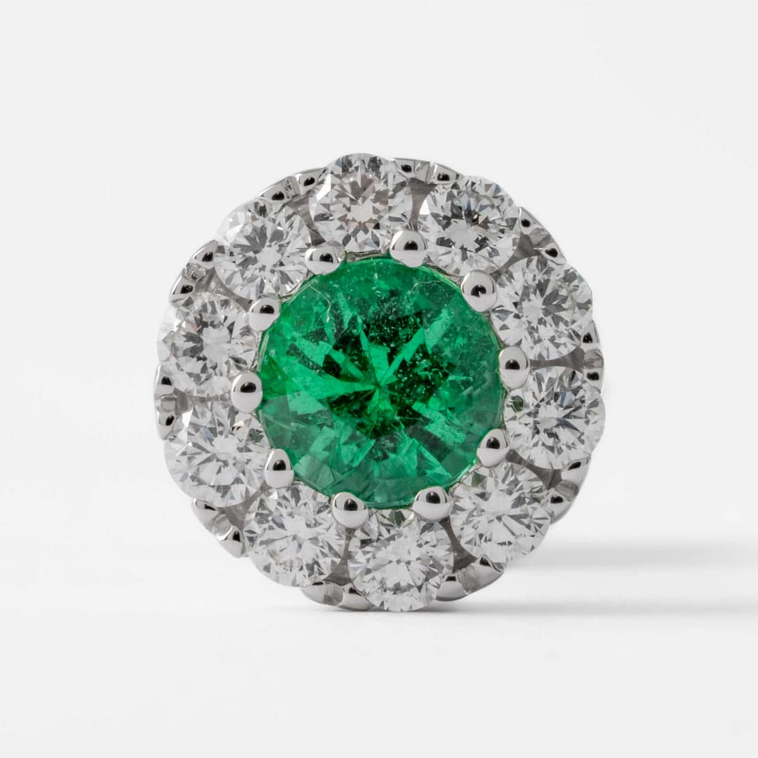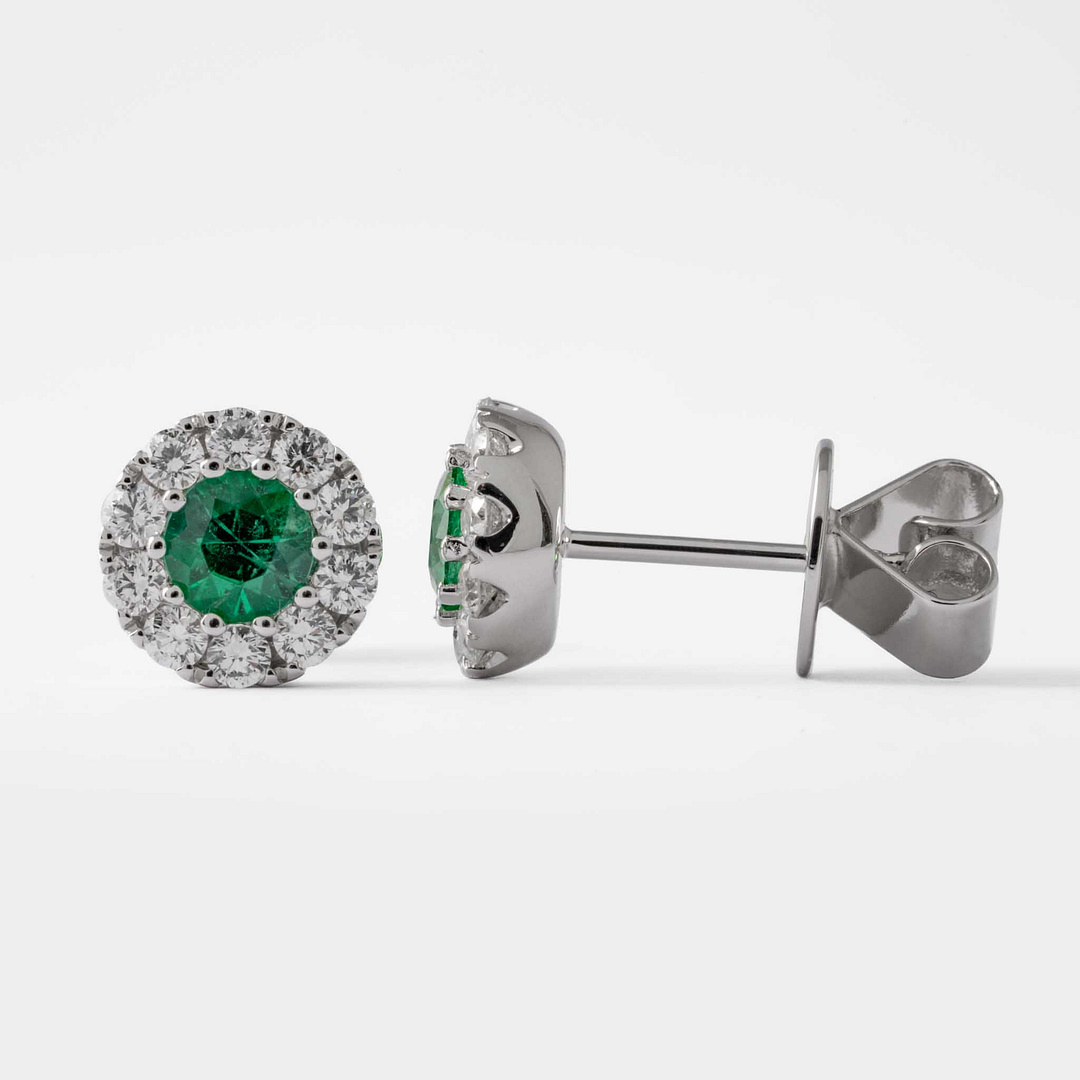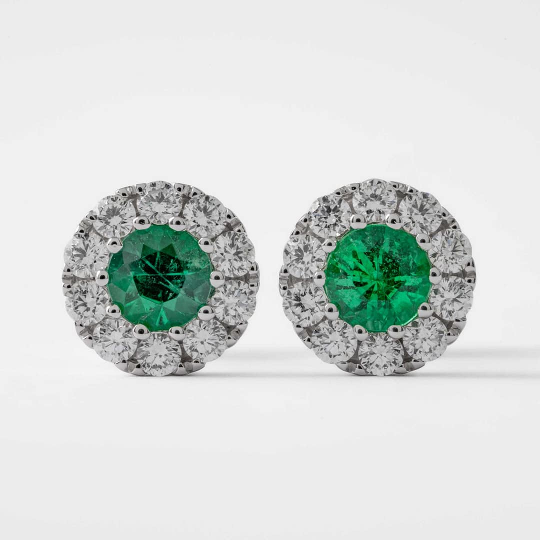18 karat white gold cluster earrings consisting of two round brilliant cut emeralds weighing a total of 0.50 carats surrounded by 20 round diamonds with a weight of 0.40 carats.