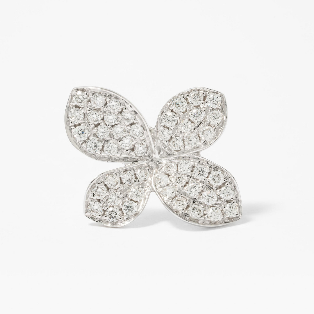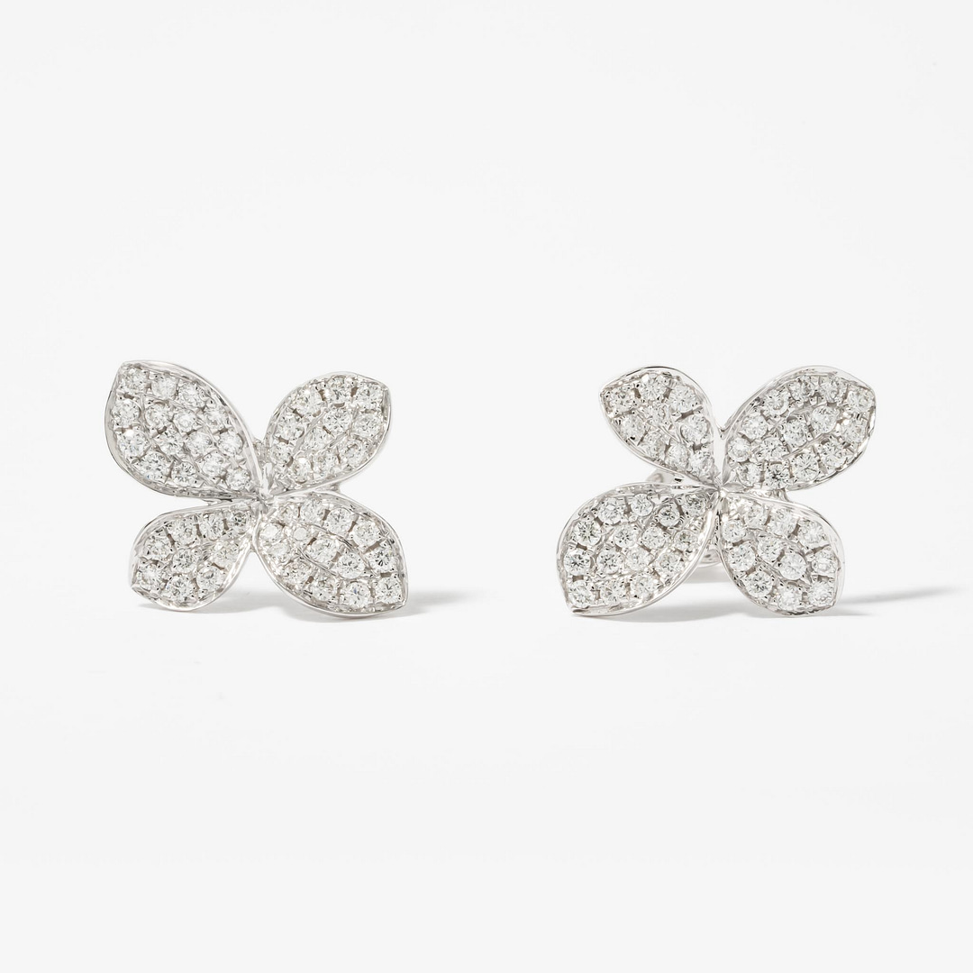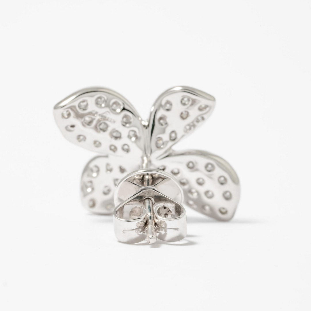 Embrace the blossoming elegance of these 18 karat white gold flower earrings, adorned with a total of 0.74 carats of round pavé diamonds. Their floral design radiates with a natural grace, perfectly suited for adding a touch of sophistication to any outfit. The intricate pavé setting allows for an all-around shine, mimicking the delicate glow of morning dew on petals.
