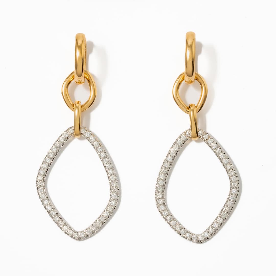 Crafted from 18 karat two-tone yellow and white gold, these Gallet earrings exude timeless elegance with 84 round diamonds totaling 0.86 carats. The diamonds, graded H-I in color and VS/SI1 in clarity, add radiant sparkle, while the detachable bail offers versatility in styling. These earrings are perfect for transitioning from day to night, offering a sophisticated look with or without the bail. The two-tone design enhances the brilliance of the diamonds, making these earrings a must-have for any jewelry collection.