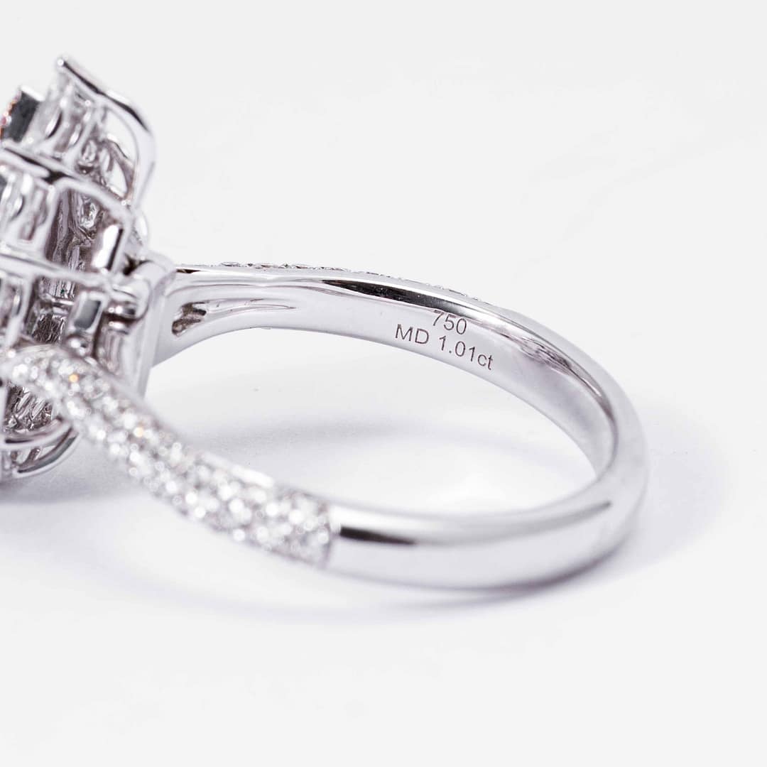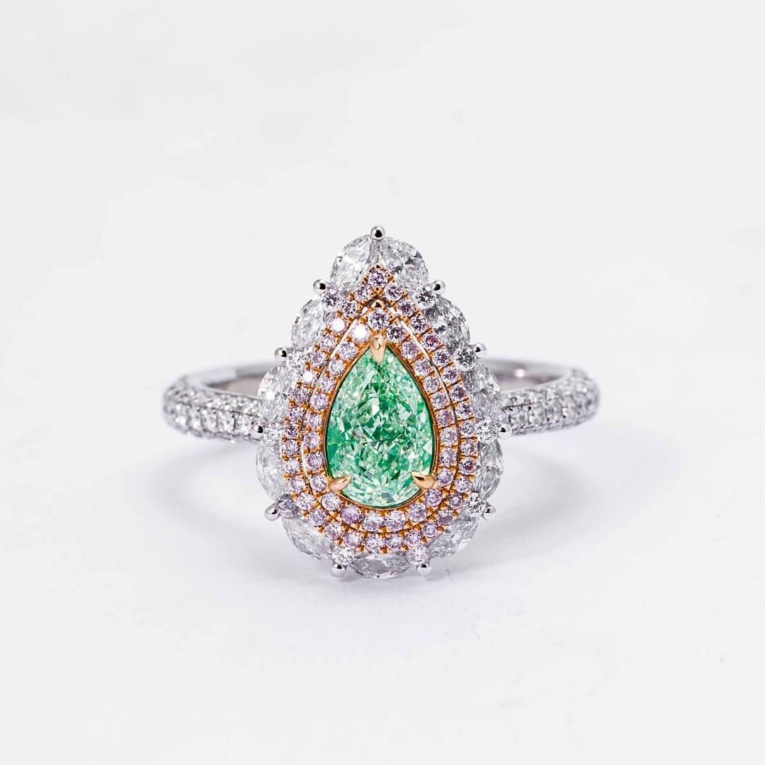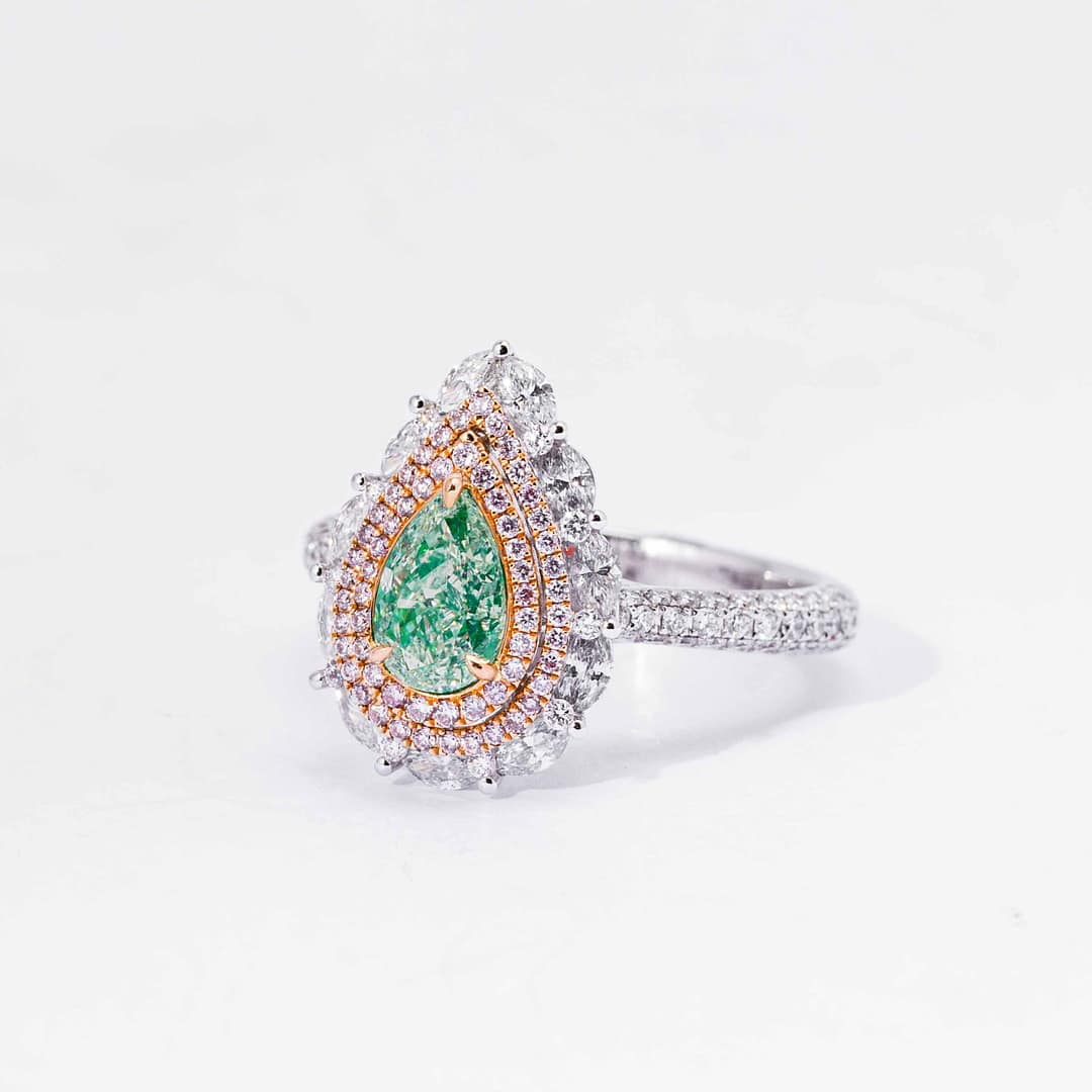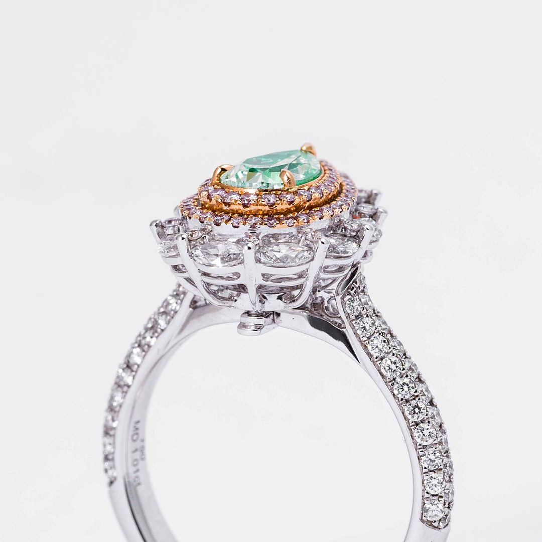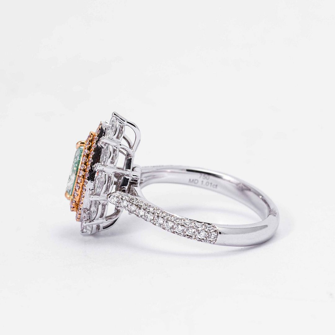 Showcasing exceptional elegance, this 18 karat white and pink gold ring is centered with a 1.01 carat pear-shaped very light green diamond (GIA# 2476699270), graded SI1 for clarity. The centerpiece is flanked by two rows of round pink diamonds totaling 0.19 carats, adding a romantic hue. Further enhancing the setting are 11 marquise diamonds totaling 0.55 carats and pavé round diamonds weighing 0.42 carats. Sized at 6.75, this ring is a masterful blend of unique color, sparkle, and refined craftsmanship.
