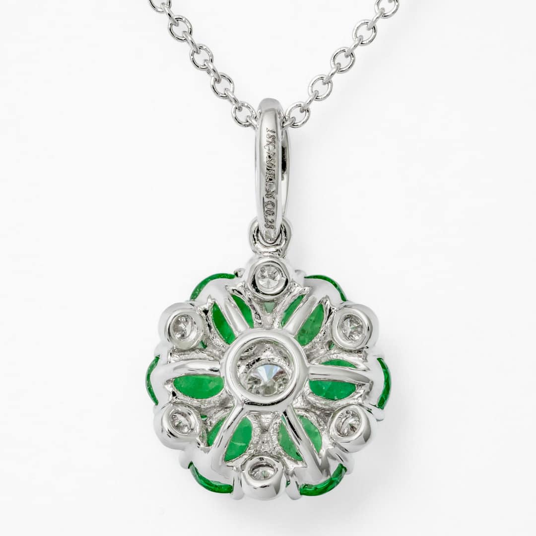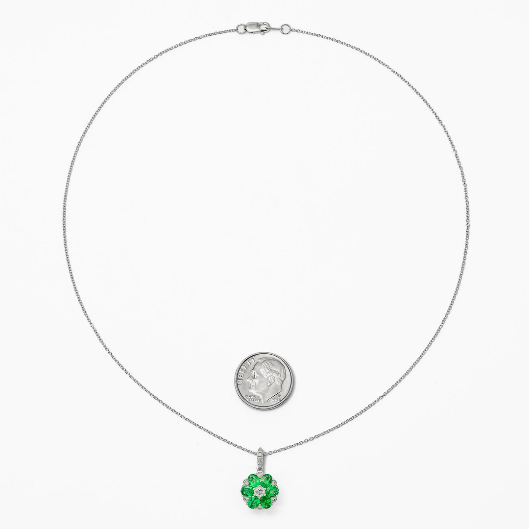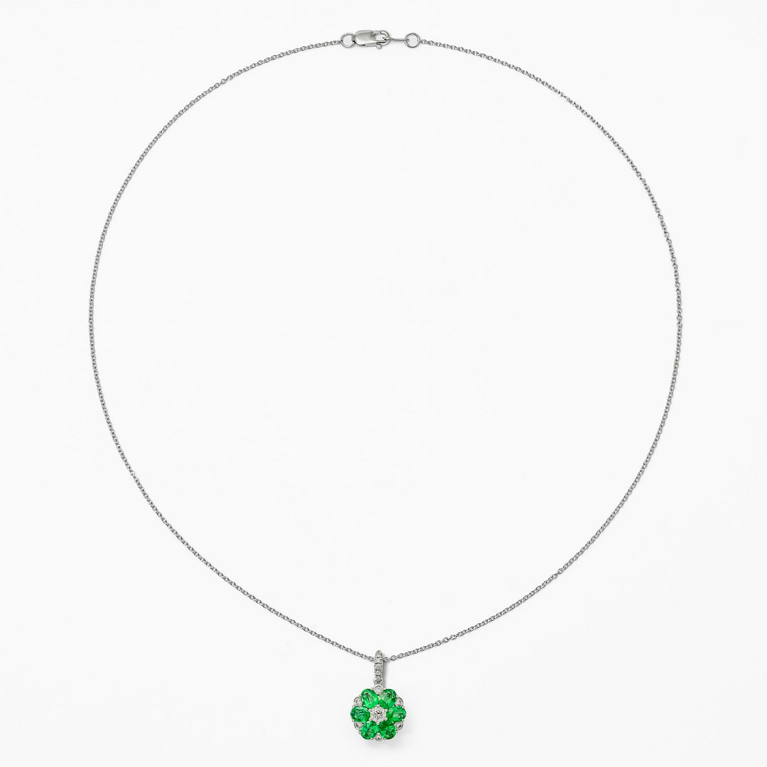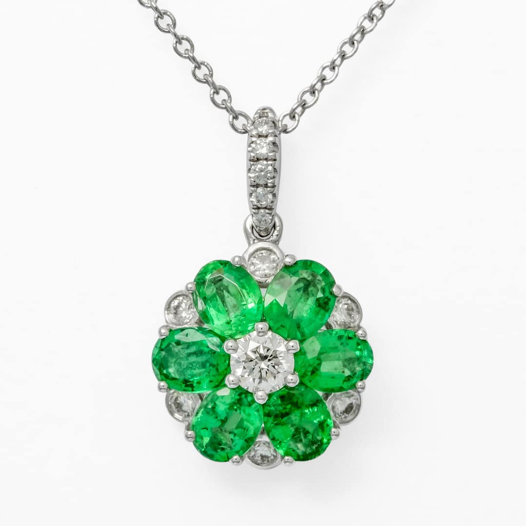 This charming 18-karat white gold flower pendant captivates with its natural allure, featuring six lustrous oval emeralds totaling 1.26 carats. These vivid green stones form the petals, while 13 round diamonds, weighing a combined 0.28 carats, glisten at the center. The pendant is gracefully suspended on an 18-inch white gold chain, creating an elegant piece that’s perfect for adding a touch of sophistication to any ensemble.