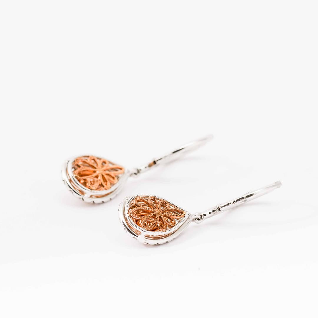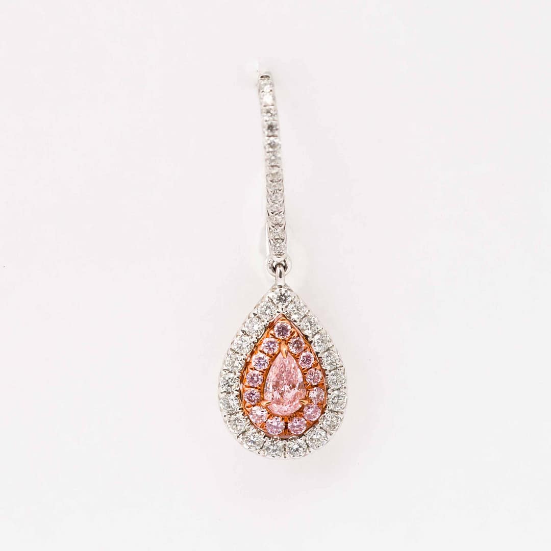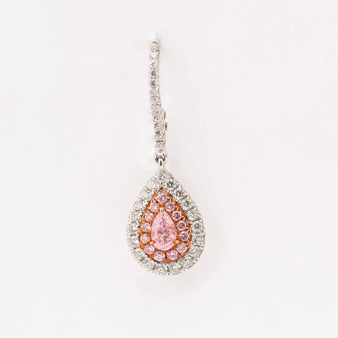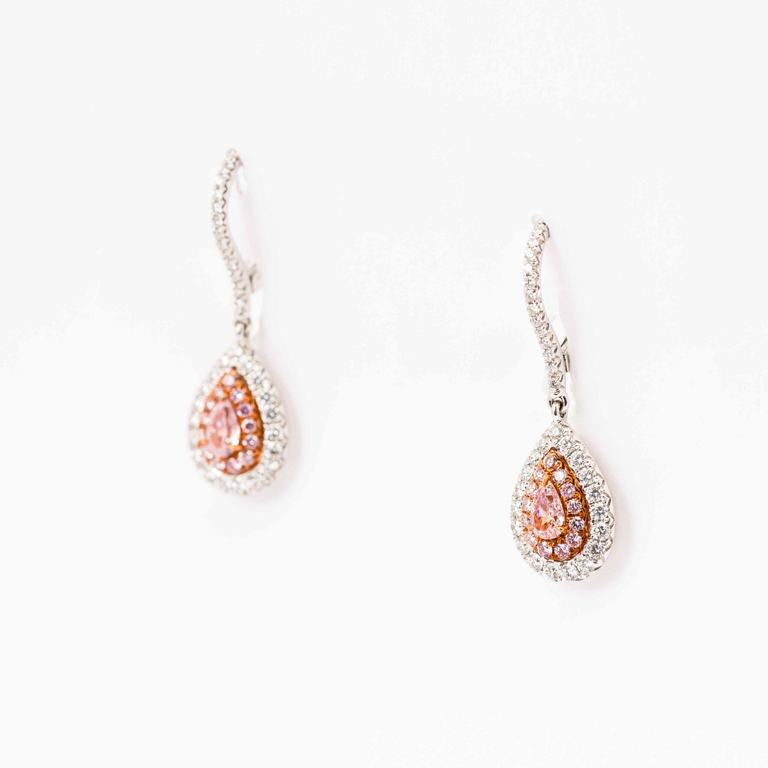 These exquisite 18 karat white and rose gold drop earrings feature two pear-shaped pink diamonds totaling 0.46 carats. Surrounding the center stones are additional round rose diamonds weighing 0.25 carats and round colorless diamonds totaling 0.63 carats, creating a harmonious blend of soft hues and radiant light. The two-tone gold enhances the delicate contrast between blush and brilliance. These drop earrings are the epitome of luxury—graceful, rare, and endlessly captivating.
