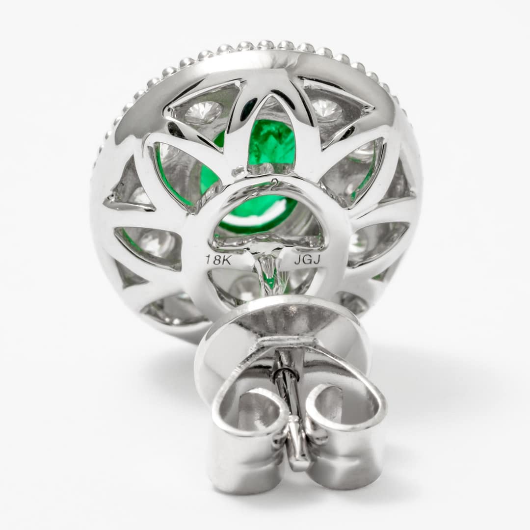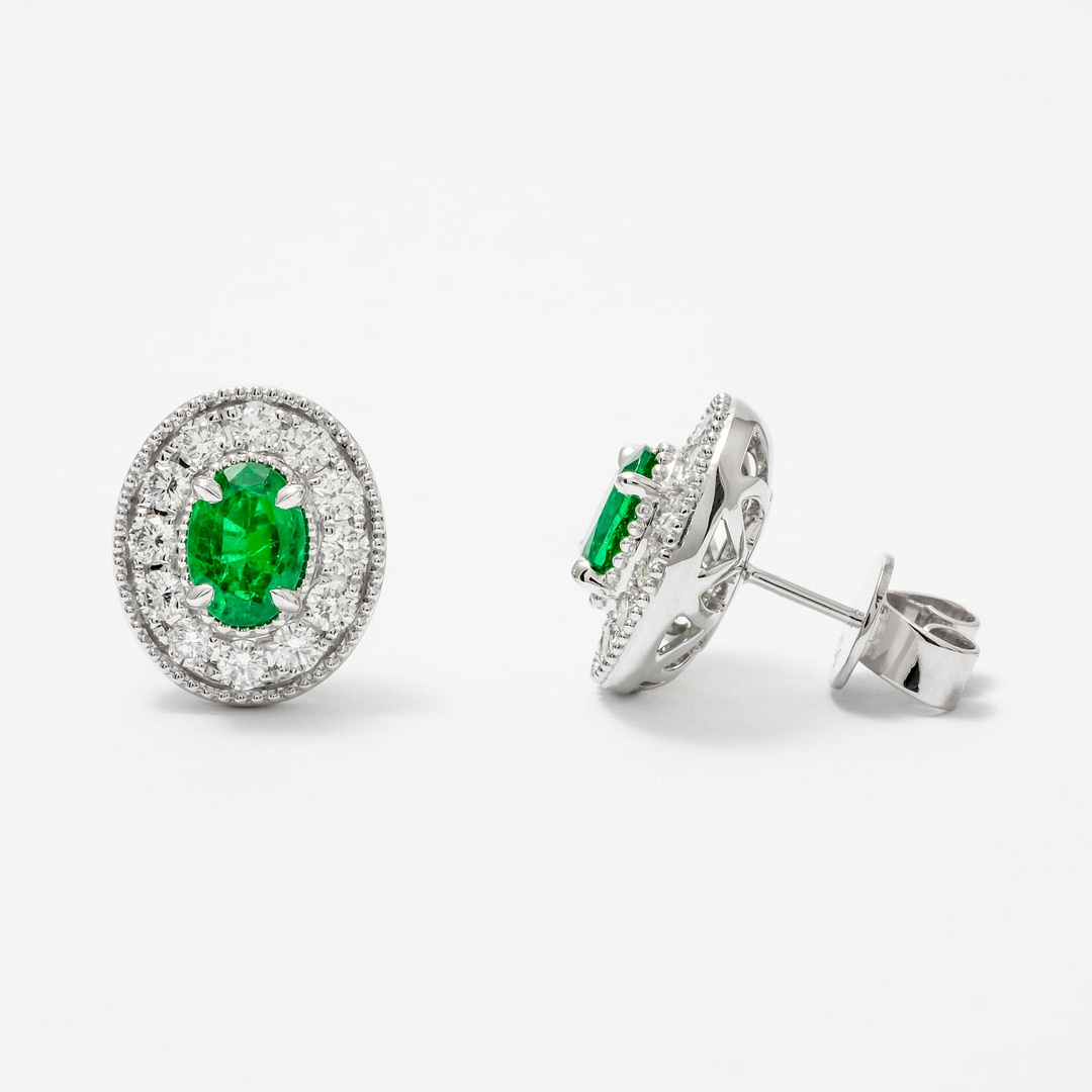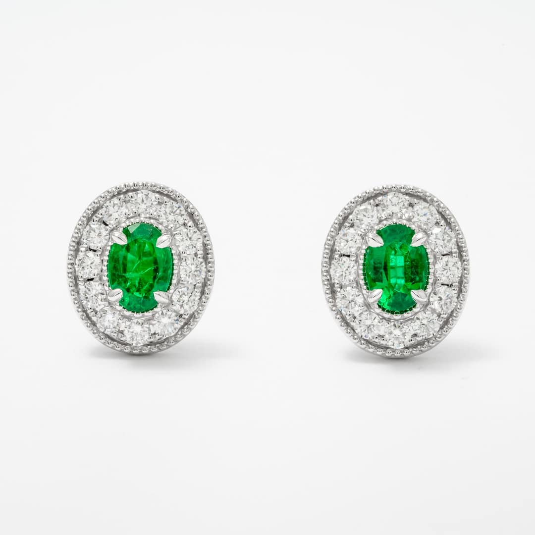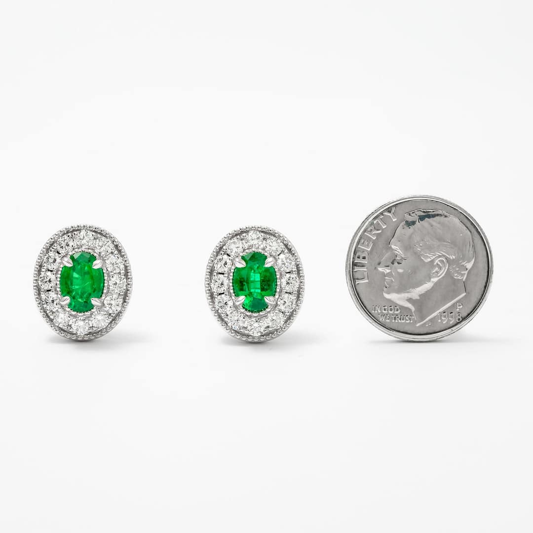 1.47 Carat Oval Emerald & Diamond Milgrain Halo Earrings (White Gold)