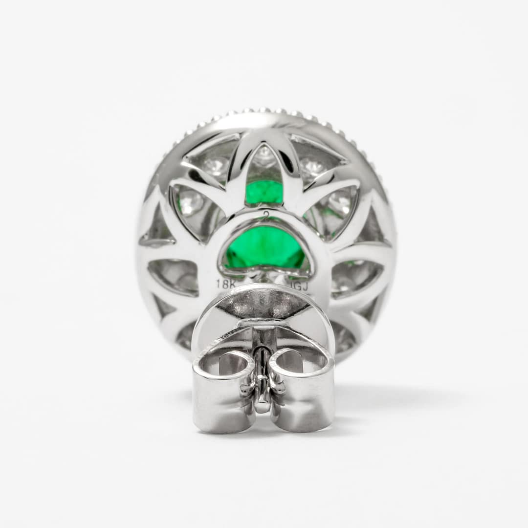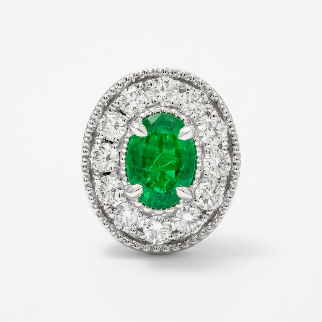 Step into luxury with these 18 karat white gold halo earrings, showcasing two captivating oval emeralds weighing a total of 1.47 carats. The emeralds are elegantly framed by 24 round pavé diamonds, totaling 1.06 carats, with delicate milgrain edges adding a touch of vintage charm. These earrings combine the rich green hue of emeralds with the timeless sparkle of diamonds, creating a sophisticated and eye-catching accessory. Perfect for special occasions or to elevate your everyday style, these earrings exude classic elegance and grace.