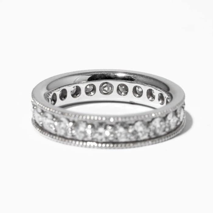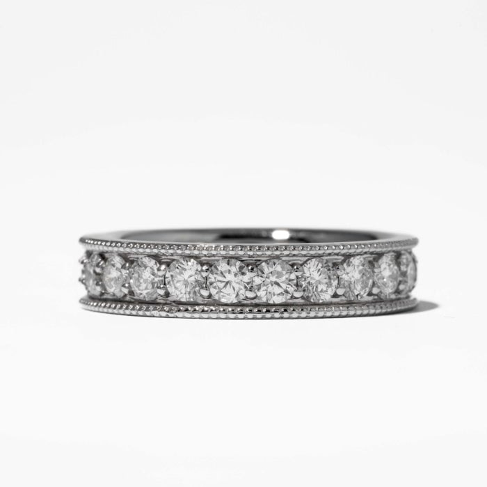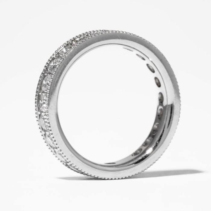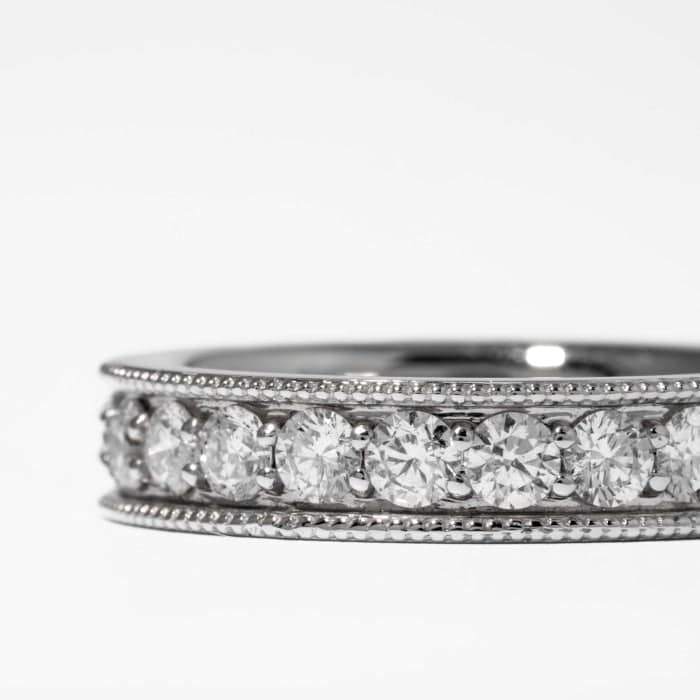 14 karat white gold channel set eternity band consisting of twenty-three (23) round brilliant cut diamonds weighing a total of 1.82 carats with milgrain edges. Ring stock size 6.5.