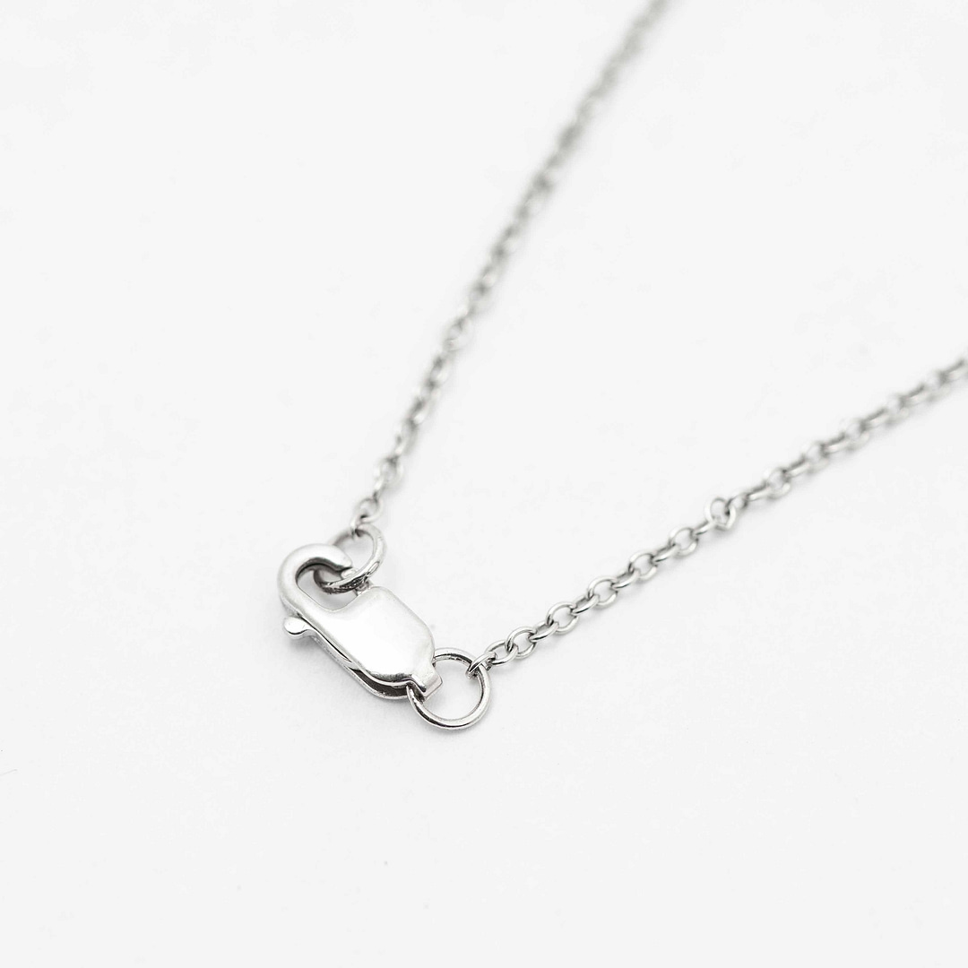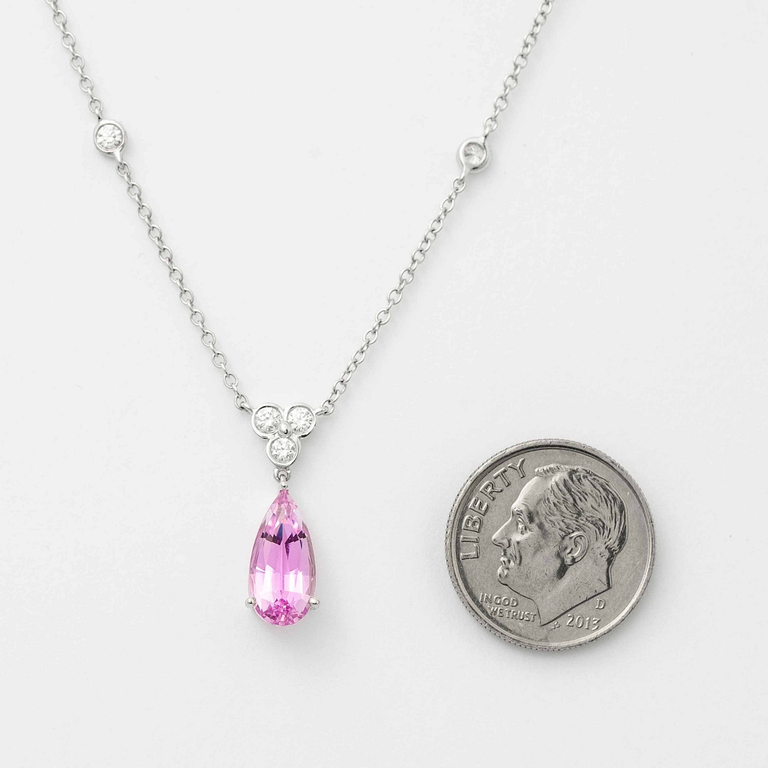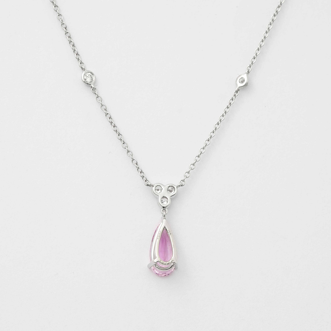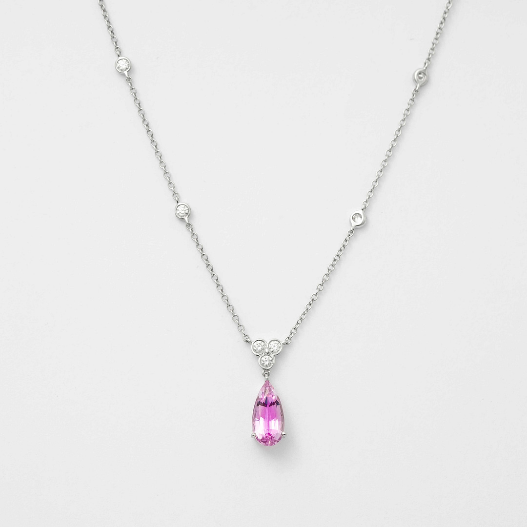 18 karat white gold pendant necklace consisting of one pear shape pink topaz stone weighing a total of 1.99 carats with seven round brilliant cut diamonds weighing 0.25 carats. Pendant hangs on a 16″ chain.