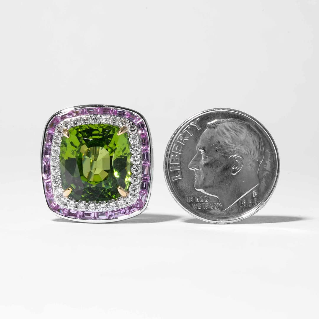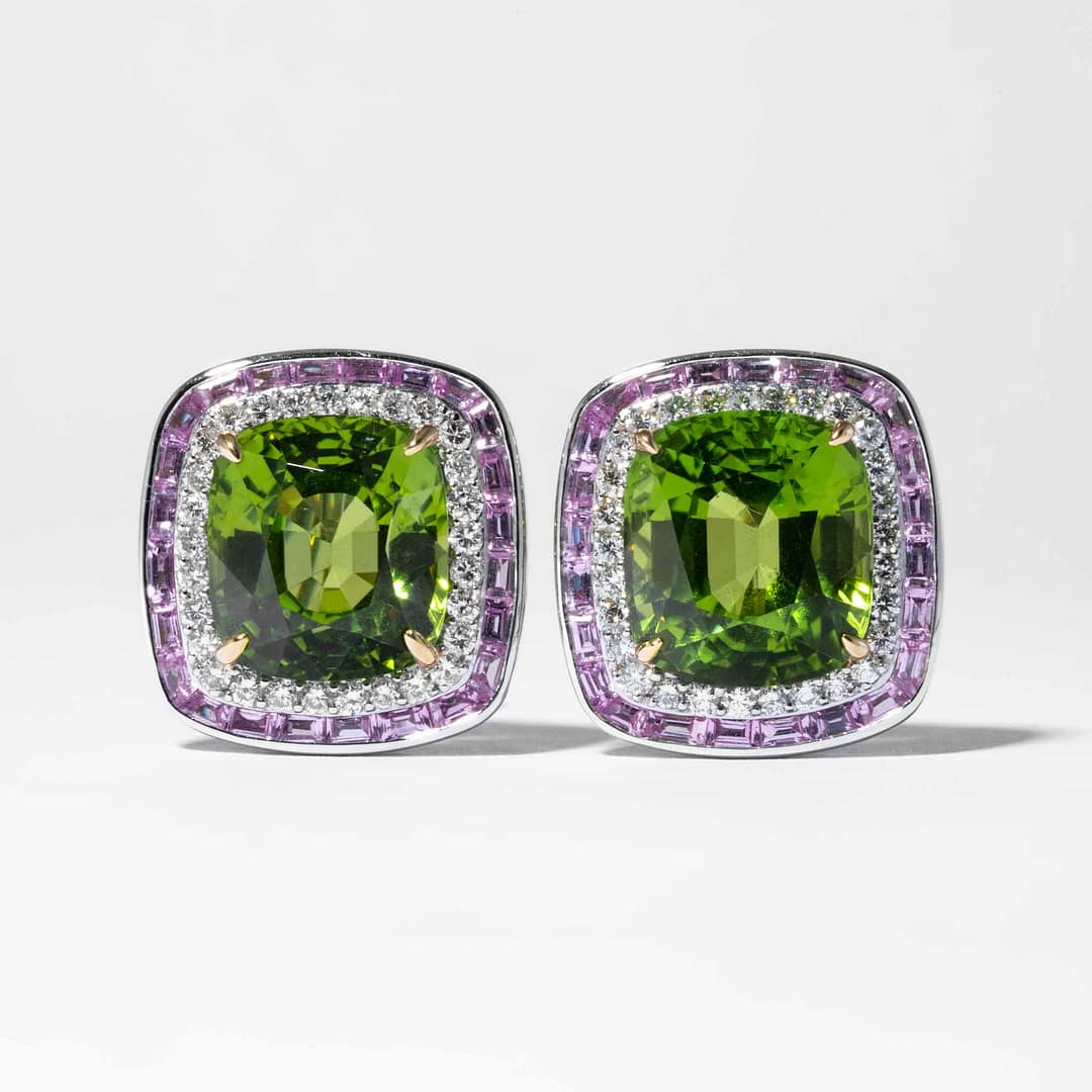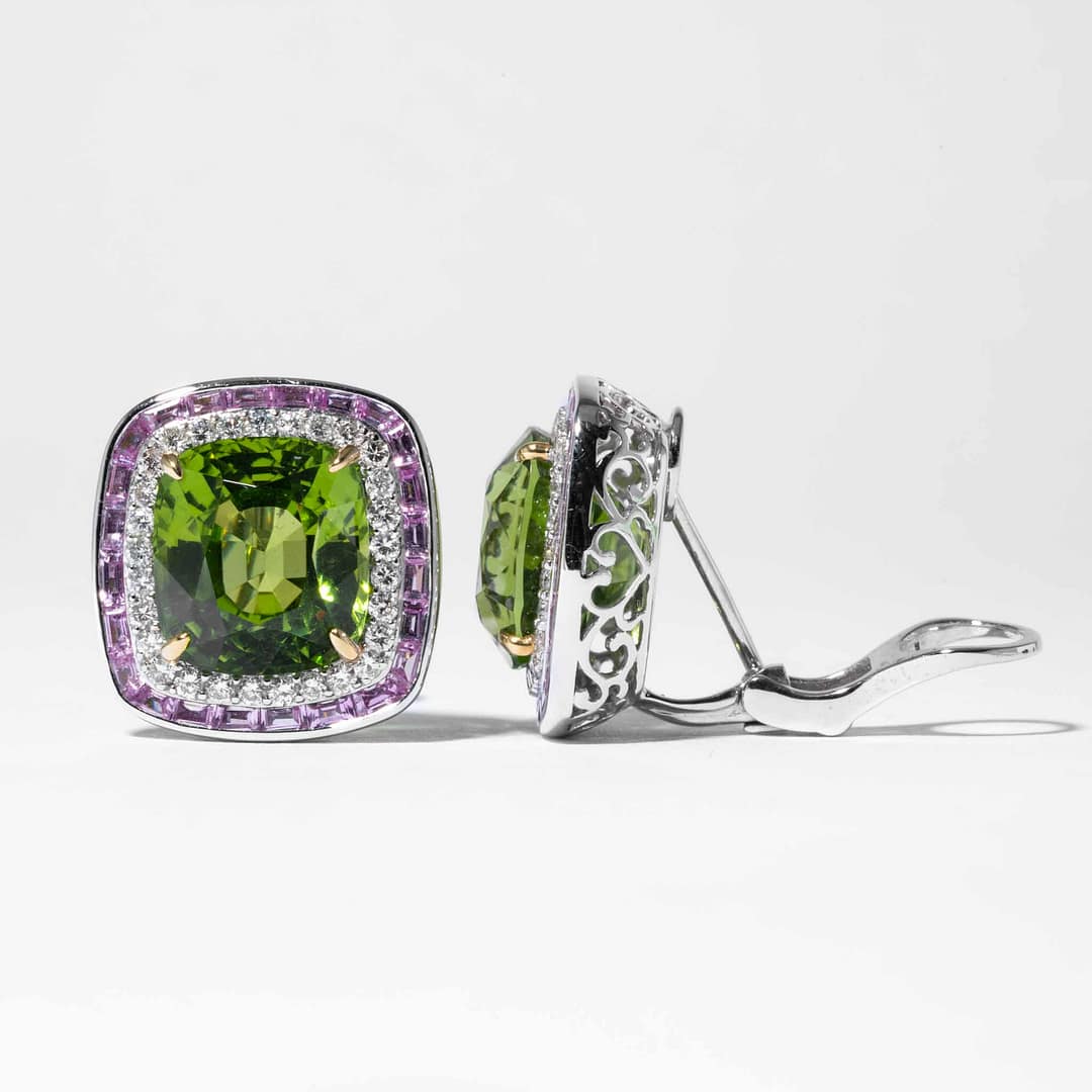 18 karat white gold earring featuring two natural Peridot gem having a combined weight of approx. 10.00 carats, surrounded by full cut diamonds and sapphire earrings.