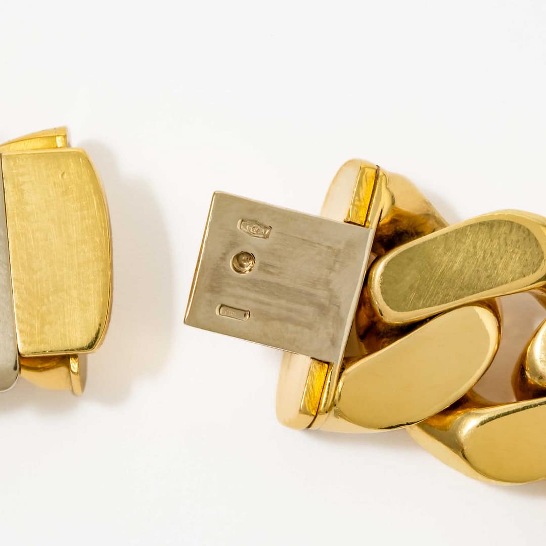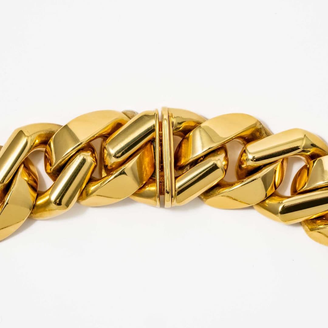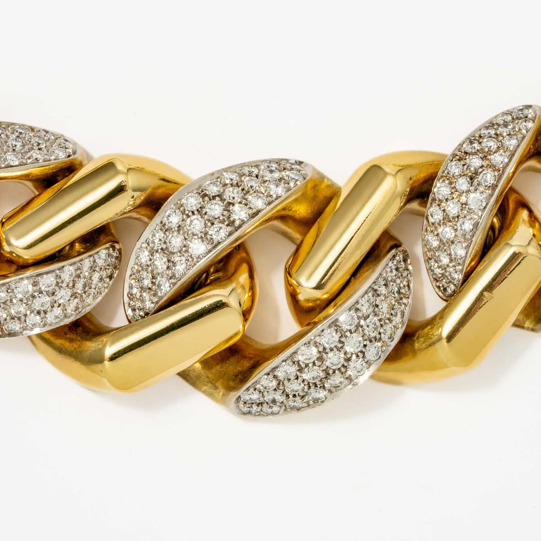 Step into vintage glamour with this 18 karat yellow gold Italian link necklace from the 1970s, adorned with 12.00 carats of diamonds. The front portion of the necklace showcases diamond-accented links, adding brilliance to the bold and substantial 186.80-gram design. Its retro-inspired craftsmanship reflects a timeless elegance, ideal for making a luxurious statement. This necklace is the epitome of sophistication, blending Italian artistry with dazzling allure.