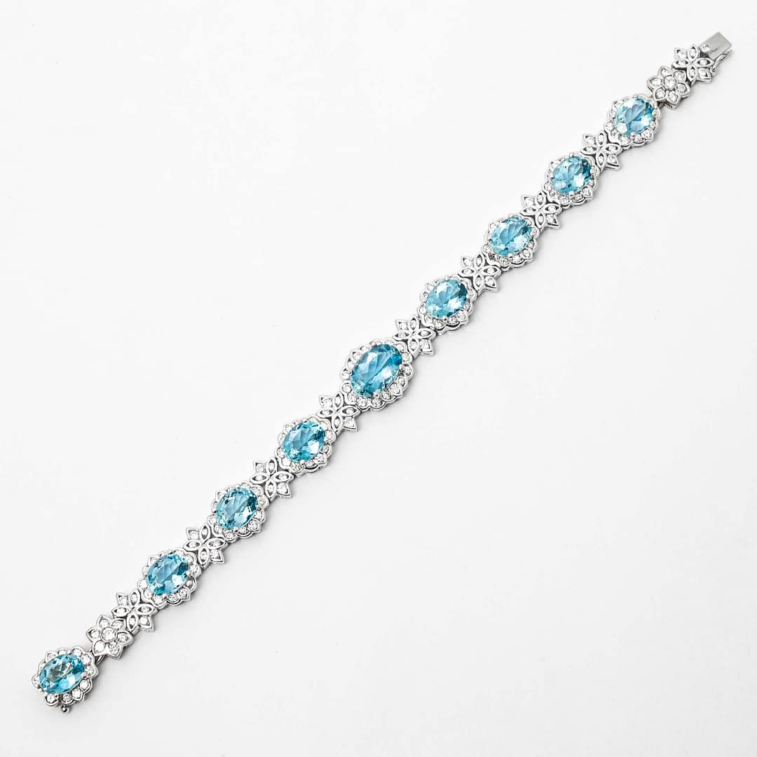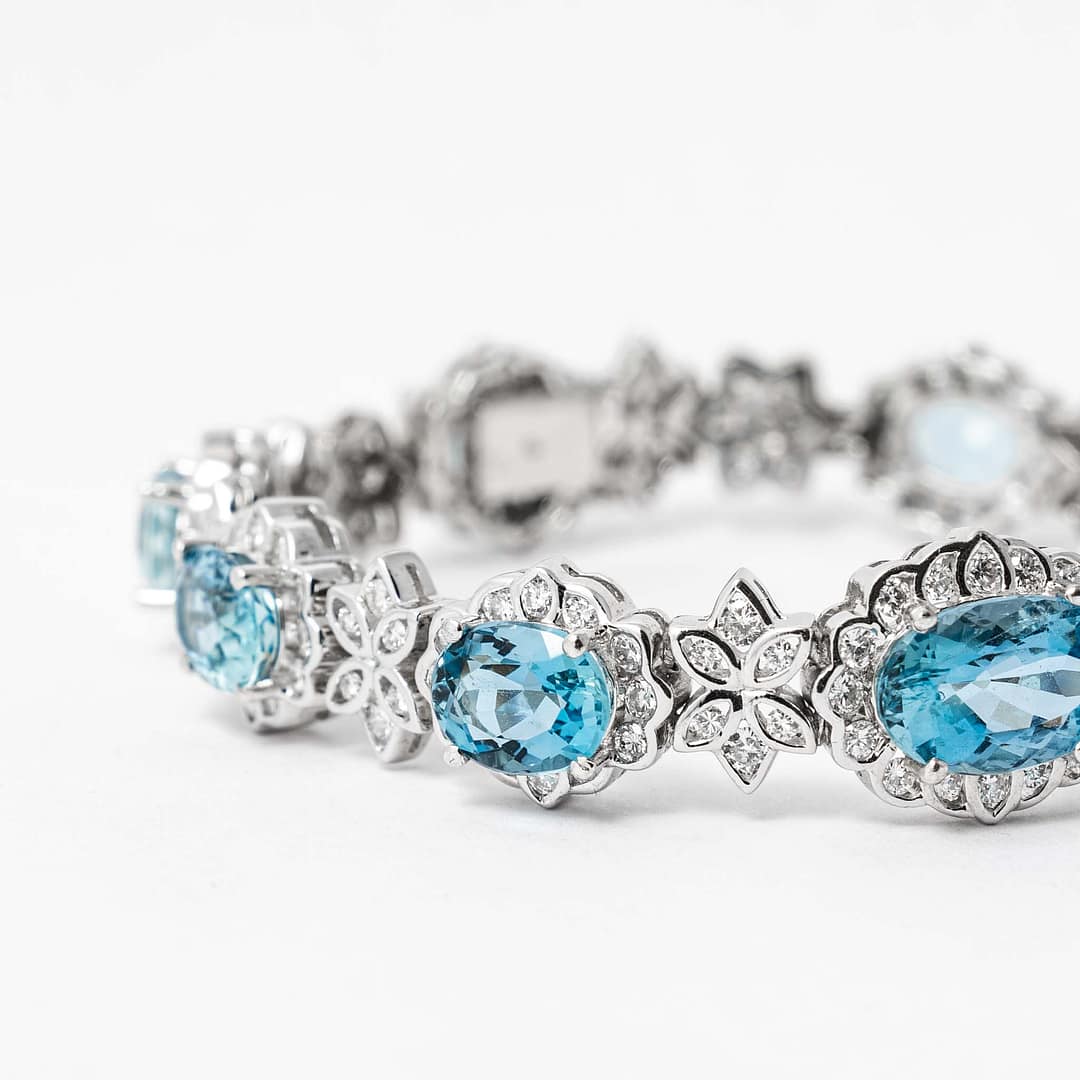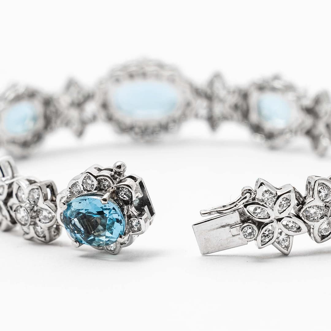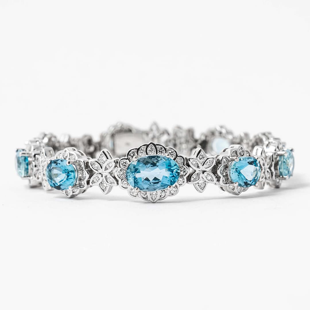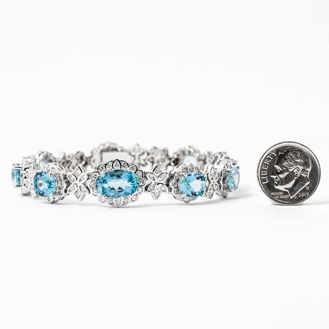 12.50 Carat Oval Shaped Aquamarine & Diamond Floral Bracelet (White Gold)