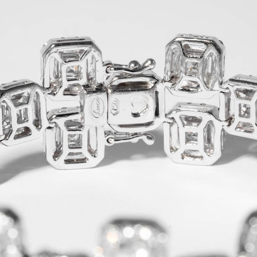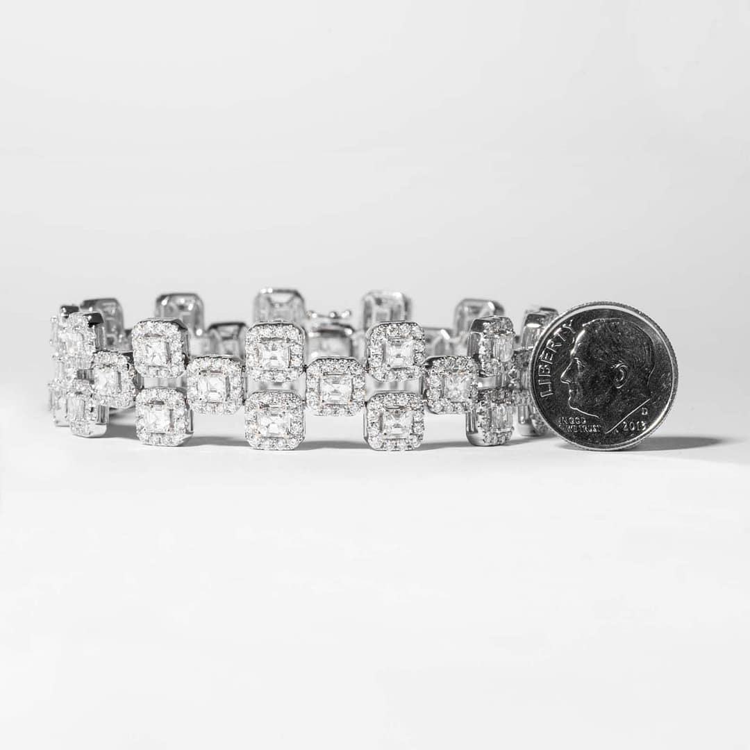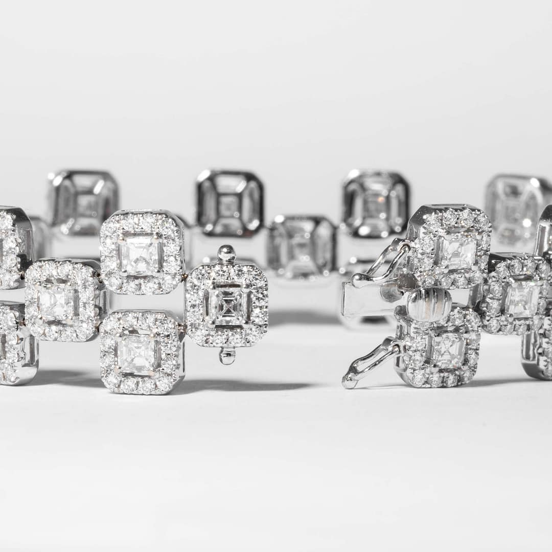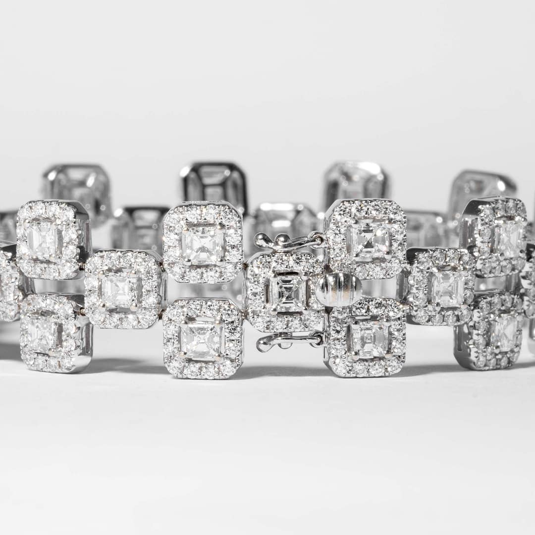 18 karat white gold diamond bracelet consisting of 39 asscher cut diamonds having a total weight of 7.64 carats with a color and clarity of H/VS2. Surrounded by full cut diamonds having a total weight of 5.10 carats
