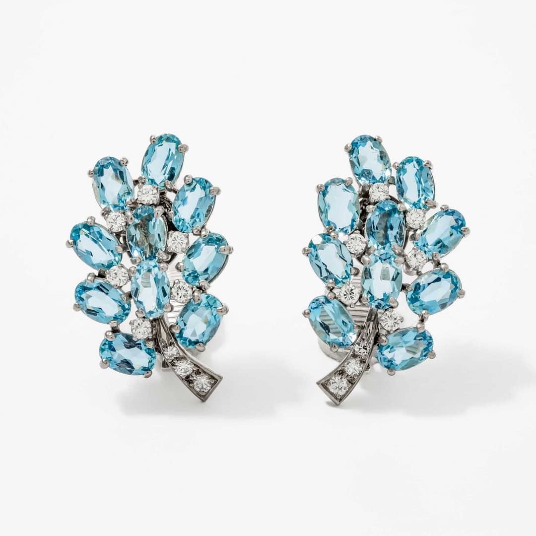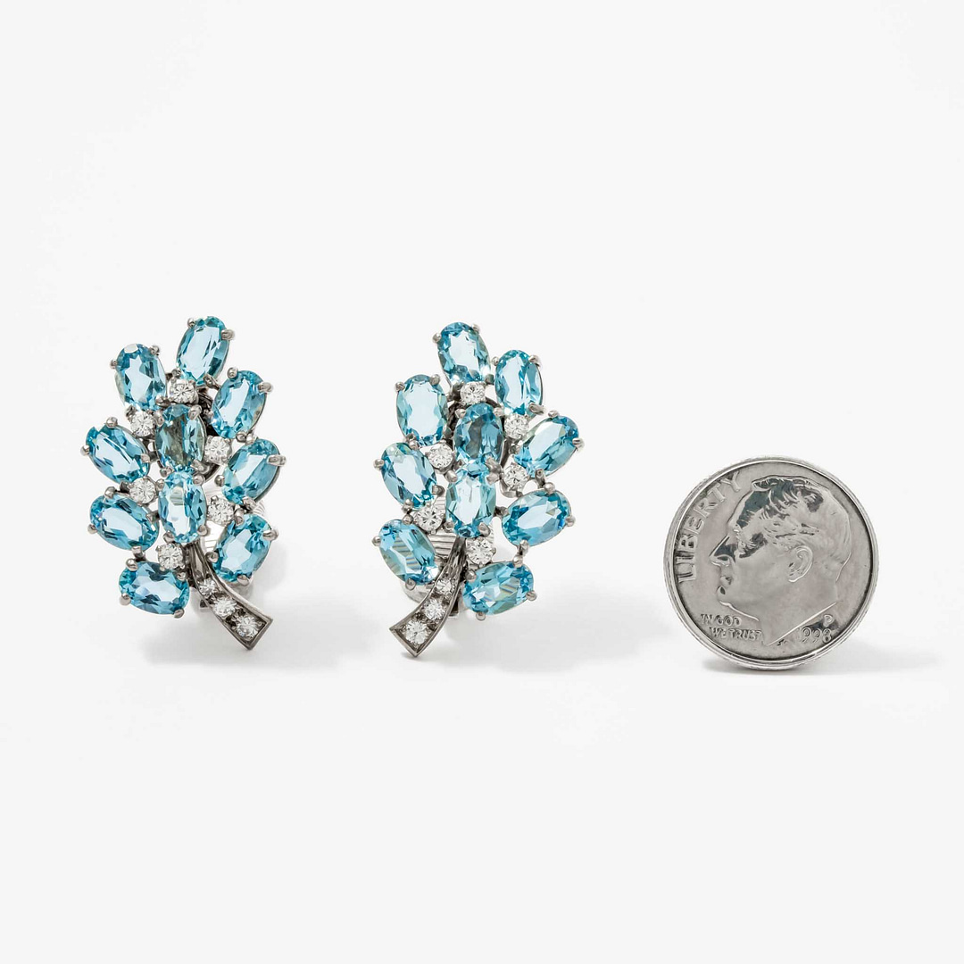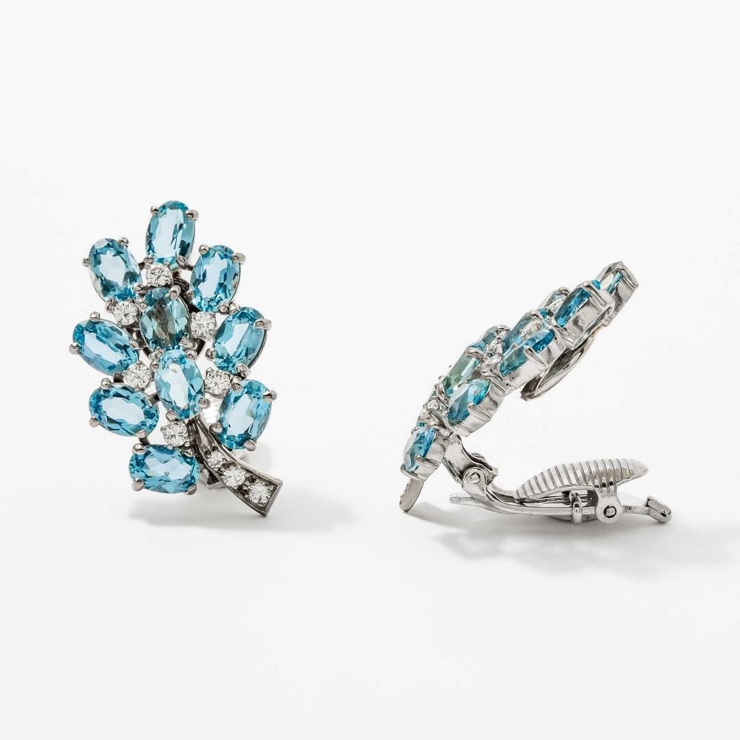 Radiate elegance with these exquisite earrings featuring a captivating cluster of ten oval aquamarine stones. Each aquamarine is accented by sparkling round brilliant-cut diamonds arranged in a swirl motif for a timeless aesthetic. Designed with clip backs, these earrings ensure both comfort and sophistication for all-day wear. Perfect for special occasions, they are a beautiful tribute to the serene blue hues of aquamarine and the brilliance of diamonds.