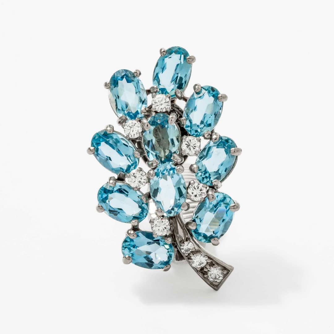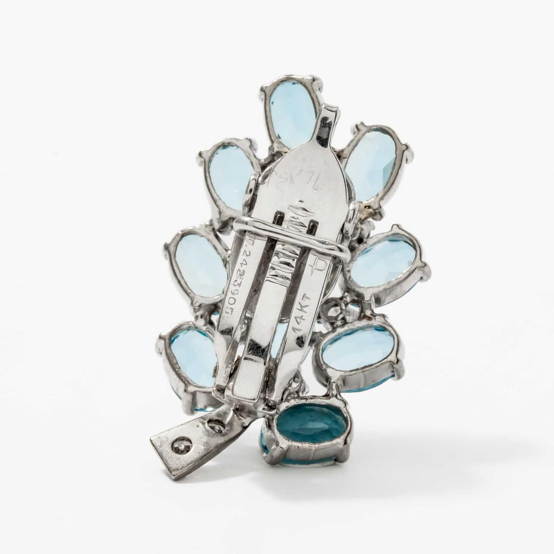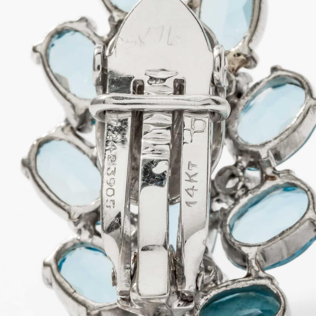 Radiate elegance with these exquisite earrings featuring a captivating cluster of ten oval aquamarine stones. Each aquamarine is accented by sparkling round brilliant-cut diamonds arranged in a swirl motif for a timeless aesthetic. Designed with clip backs, these earrings ensure both comfort and sophistication for all-day wear. Perfect for special occasions, they are a beautiful tribute to the serene blue hues of aquamarine and the brilliance of diamonds.