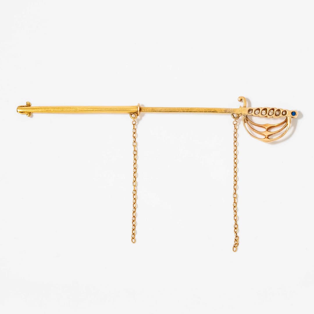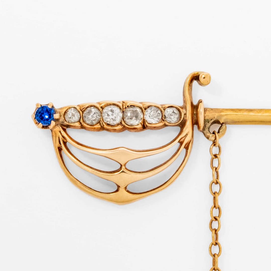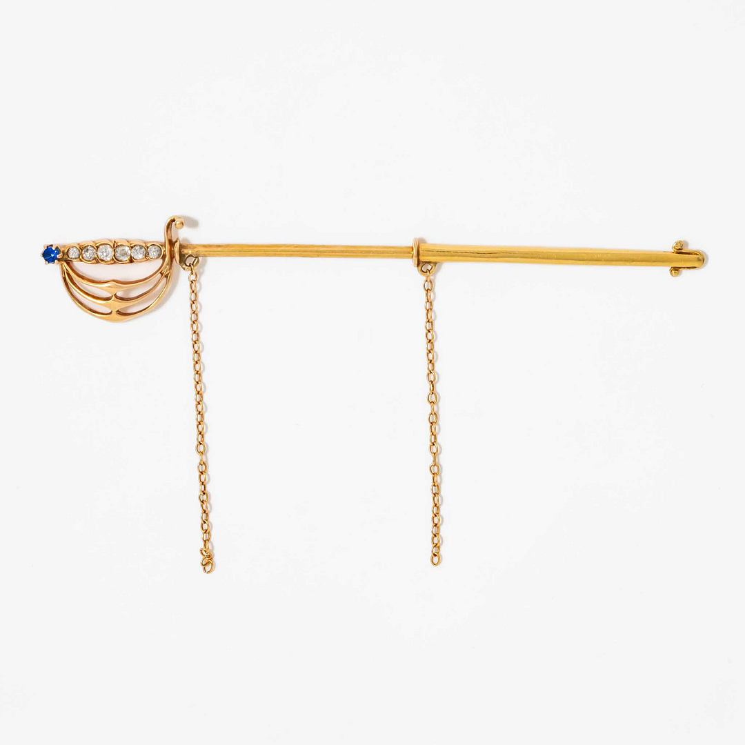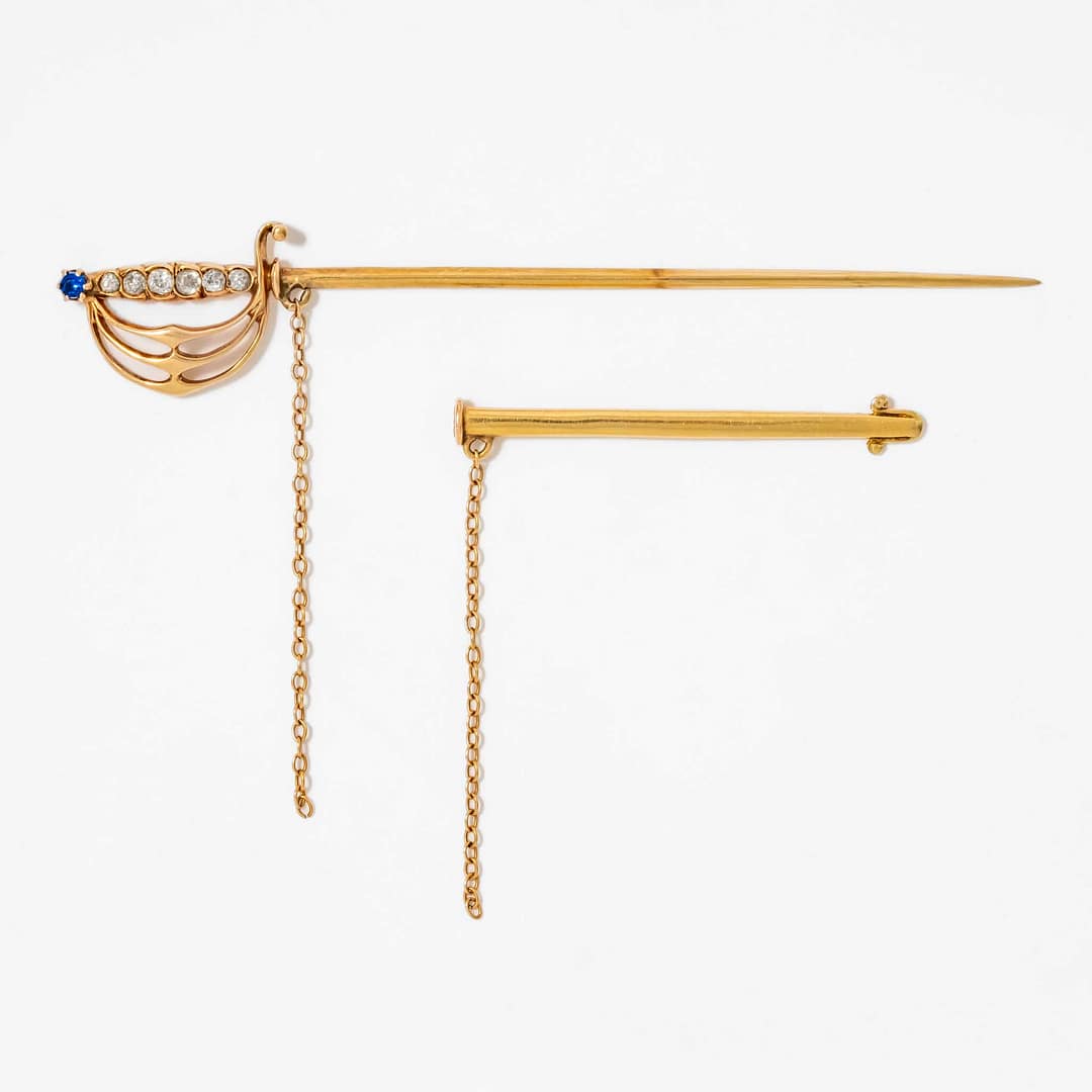 18 Karat Antique Chevalier’s Diamond & Sapphire Rapier Pin (Yellow Gold)