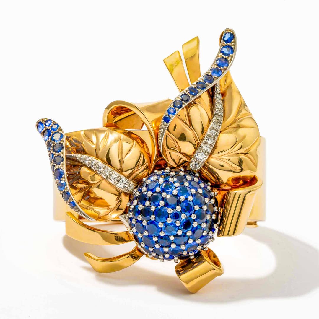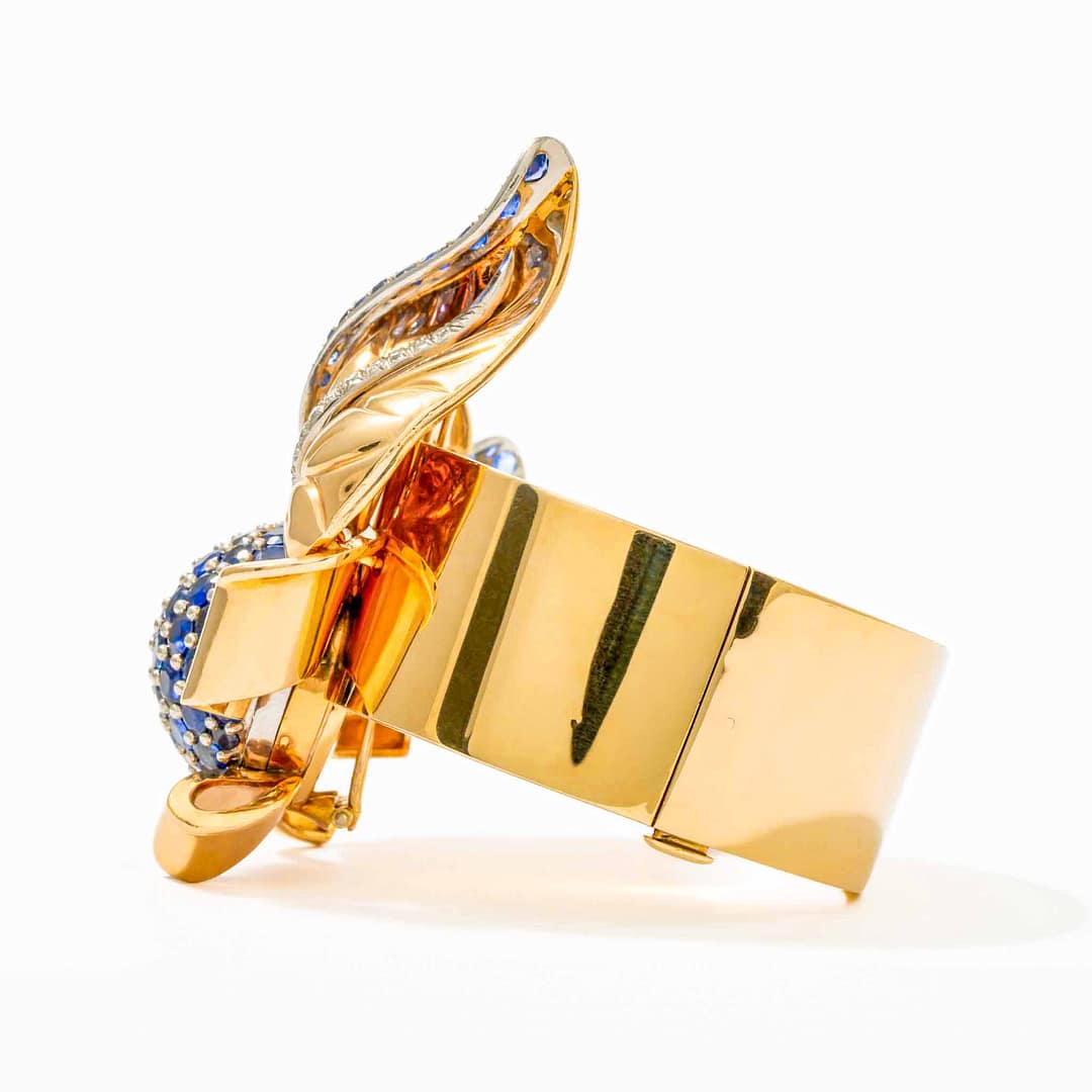 18 Karat Sapphire and Diamond Leaf Bangle Bracelet (Two Tone)