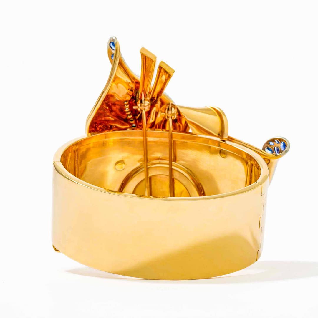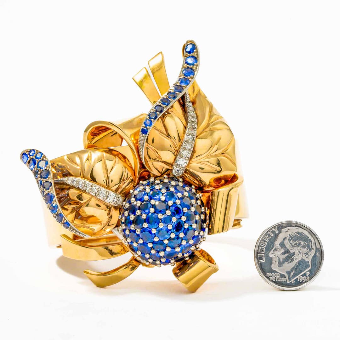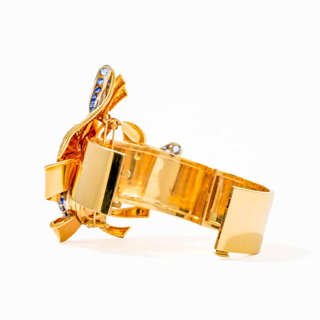 Experience vintage charm with this unique pink and white gold bangle from the 1940s, adorned with sapphire and diamond leaf motifs and a hidden Tobias watch. The removable leaf design unveils a gold-tone dial with black Arabic and stick markers, complemented by elegant blued hands. This exceptional piece merges fine craftsmanship with practical functionality, making it both a statement accessory and a timepiece. A true collector’s item, it captures the glamour and innovation of a bygone era.