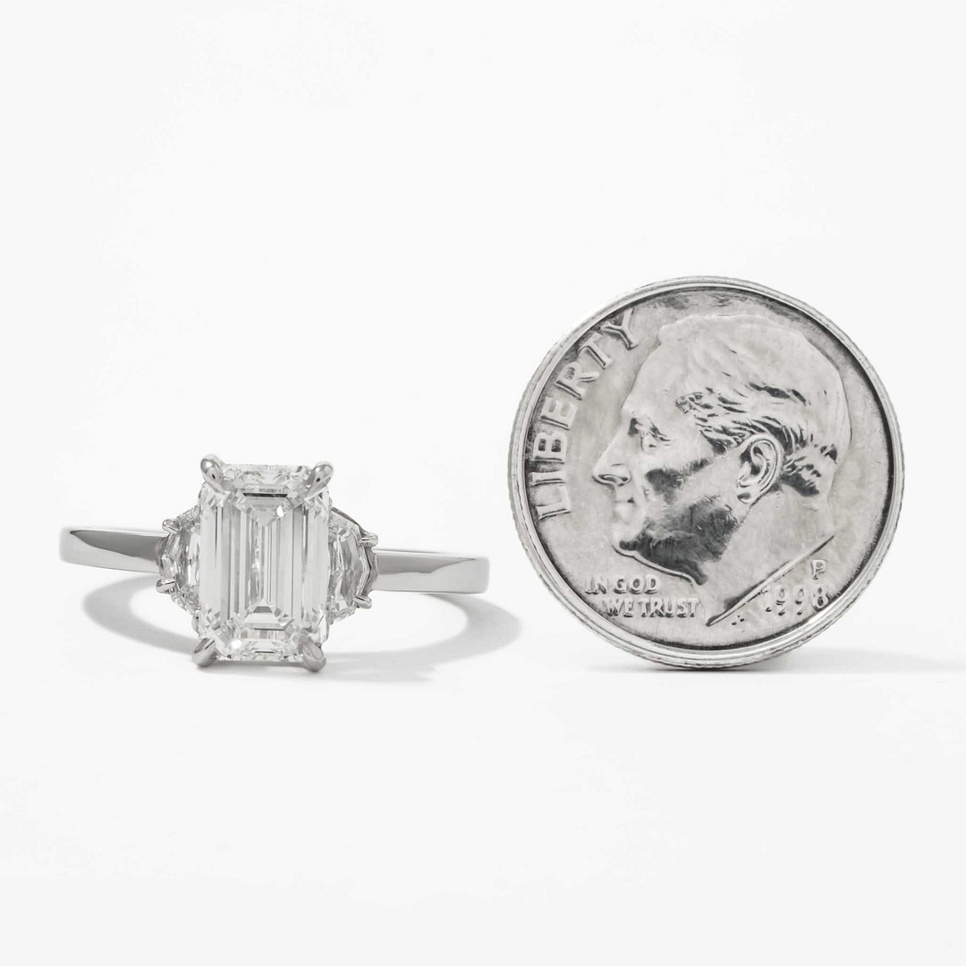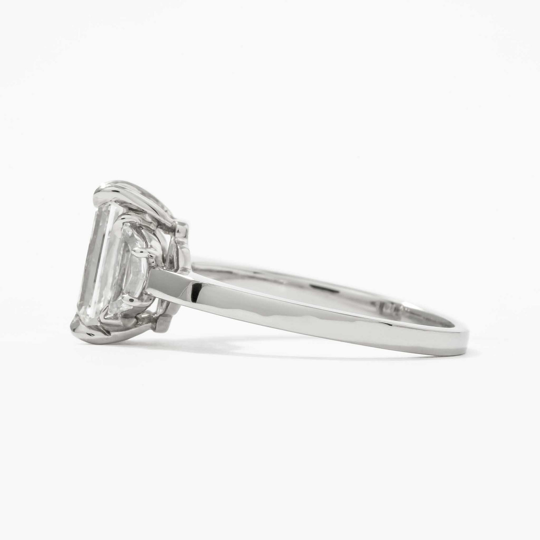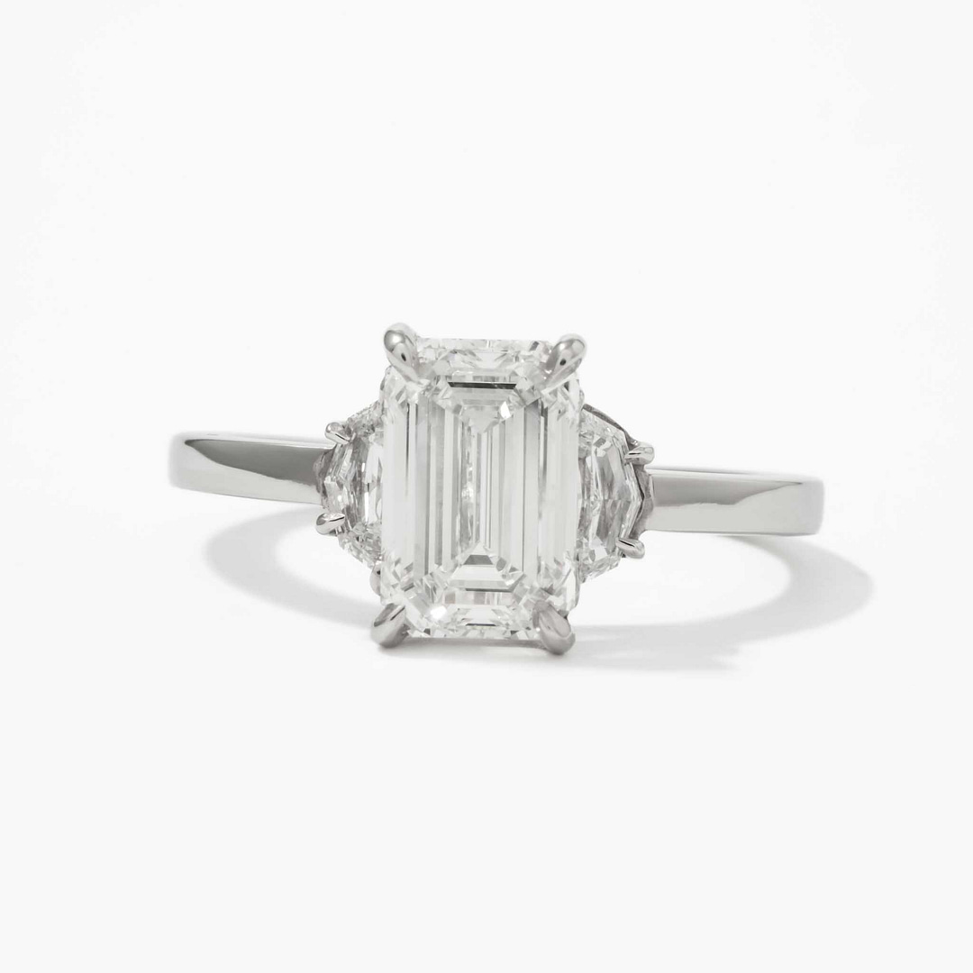 Celebrate timeless sophistication with this three-stone diamond ring, centered on a 2.01 carat emerald-cut diamond with G/VS1 color and clarity, certified by GIA (Report #2458936557). Measuring 8.90 x 5.79 x 3.90 mm, the center diamond is complemented by two shield-cut diamonds totaling 0.34 carats, with H/VS1 color and clarity. The handmade platinum setting features elegant claw prongs, adding a refined touch to the design. Sized at 6, this ring is a masterpiece of understated luxury, perfect for life’s most significant milestones.