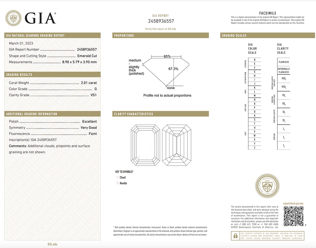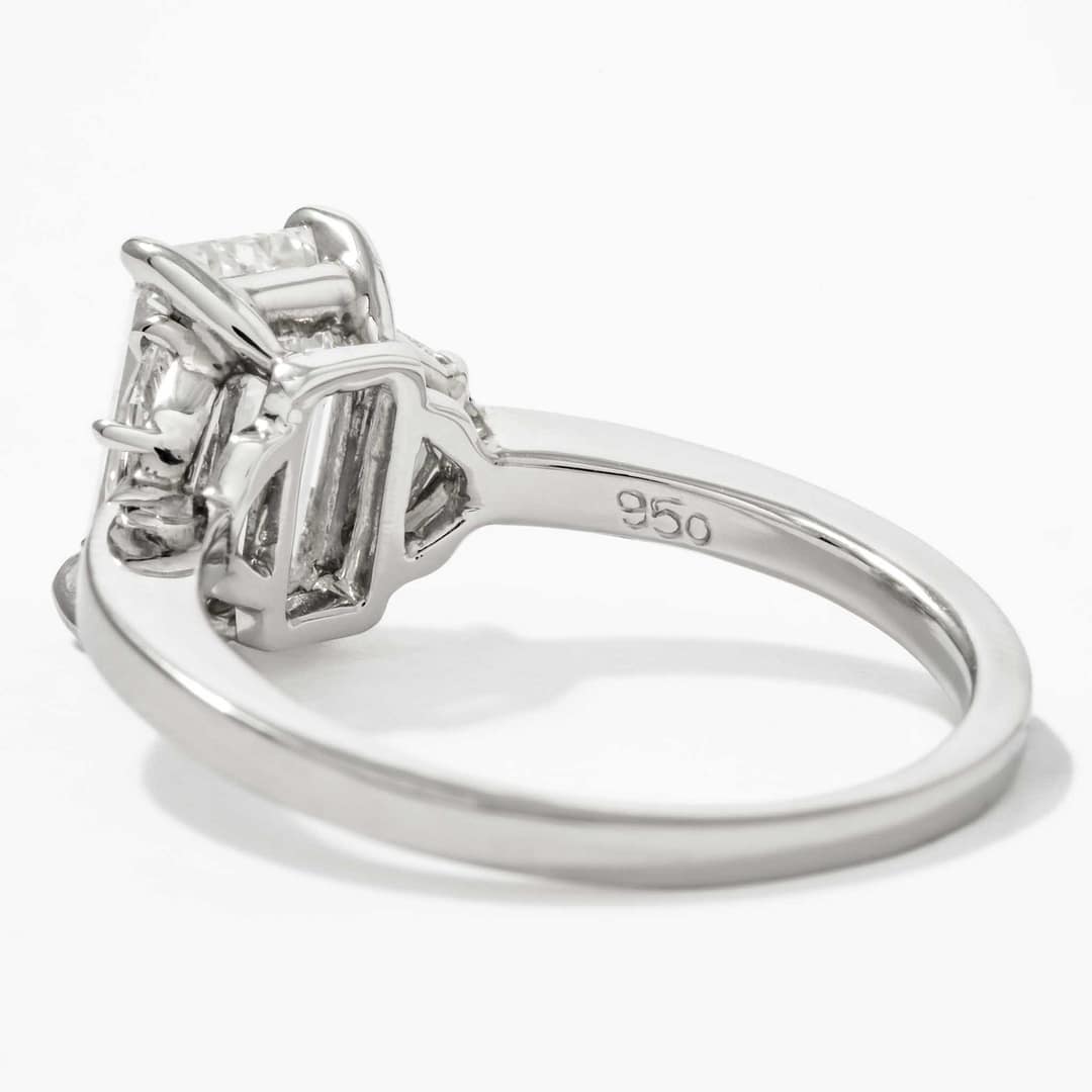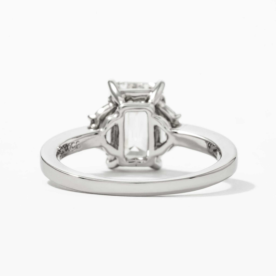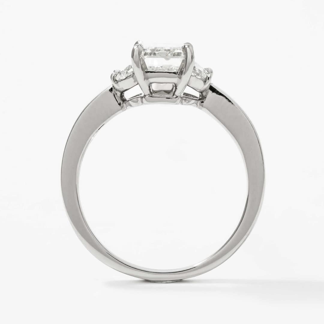 Celebrate timeless sophistication with this three-stone diamond ring, centered on a 2.01 carat emerald-cut diamond with G/VS1 color and clarity, certified by GIA (Report #2458936557). Measuring 8.90 x 5.79 x 3.90 mm, the center diamond is complemented by two shield-cut diamonds totaling 0.34 carats, with H/VS1 color and clarity. The handmade platinum setting features elegant claw prongs, adding a refined touch to the design. Sized at 6, this ring is a masterpiece of understated luxury, perfect for life’s most significant milestones.