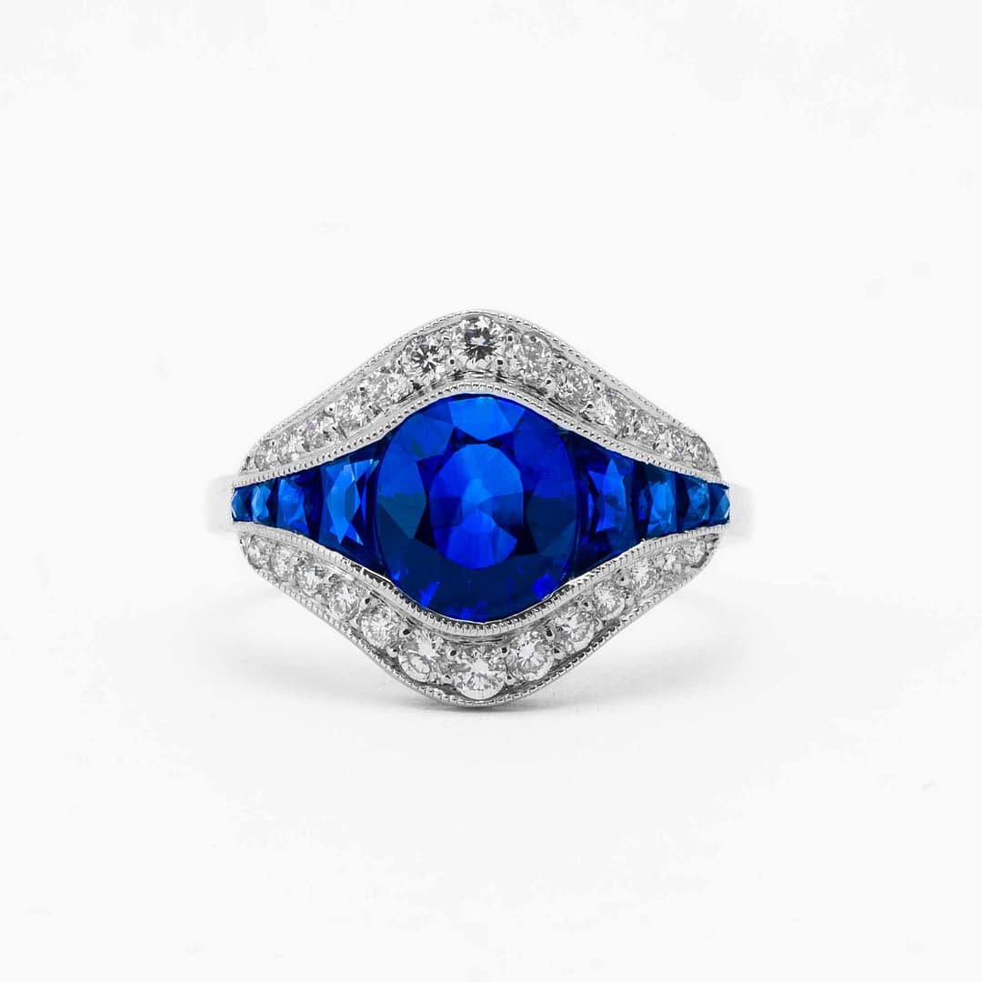 This exquisite platinum Art Deco-inspired ring features a 2.15 carat oval-shaped sapphire at its center, surrounded by eight custom-cut sapphires totaling 1.14 carats. The sapphires are bordered by a halo of full-cut diamonds, adding a total of 0.40 carats of brilliance to the design. Meticulously crafted, this ring embodies the elegance and glamour of the Art Deco era. A true celebration of fine jewelry craftsmanship, this piece is ideal for those seeking a timeless statement ring.