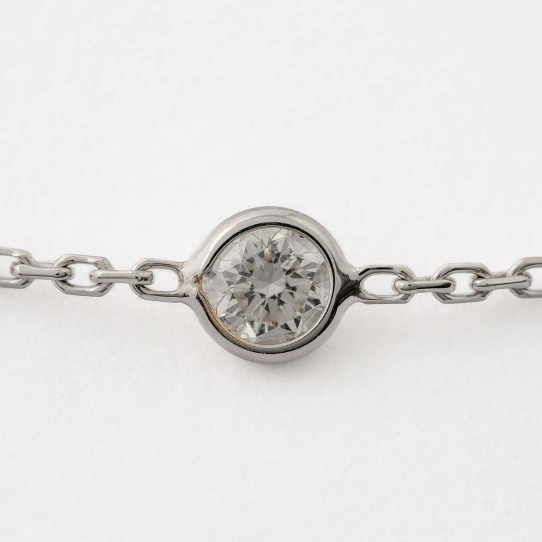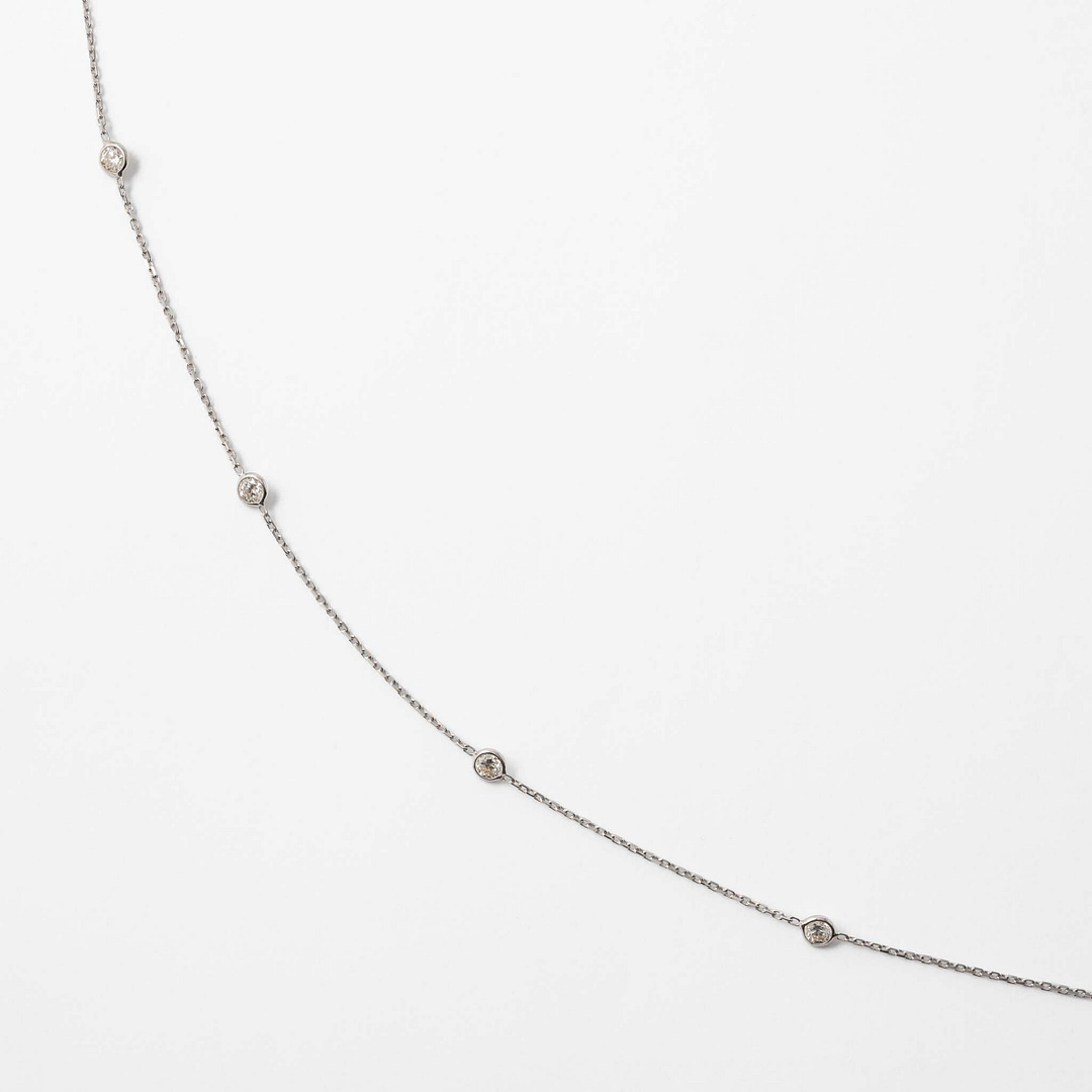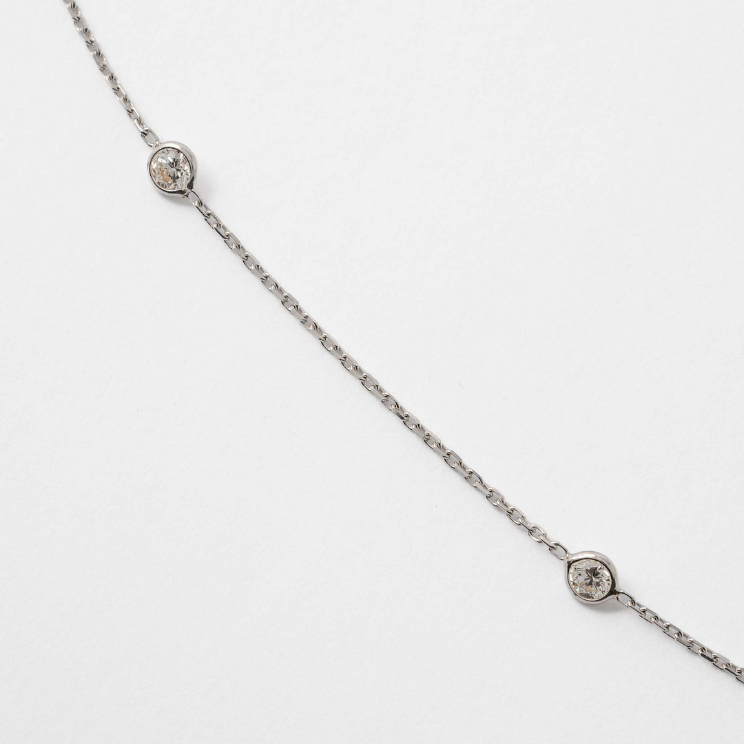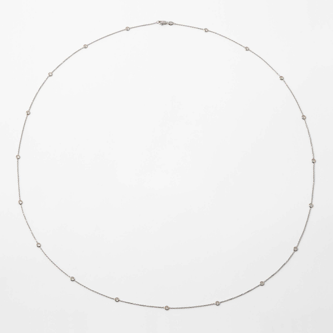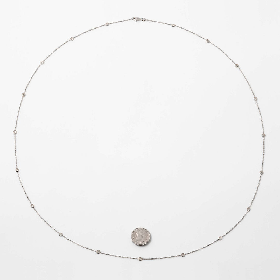 14 karat white gold 30″ diamonds by the yard necklace consisting of 19 round bezel set round diamonds weighing a total of 2.18 carats.