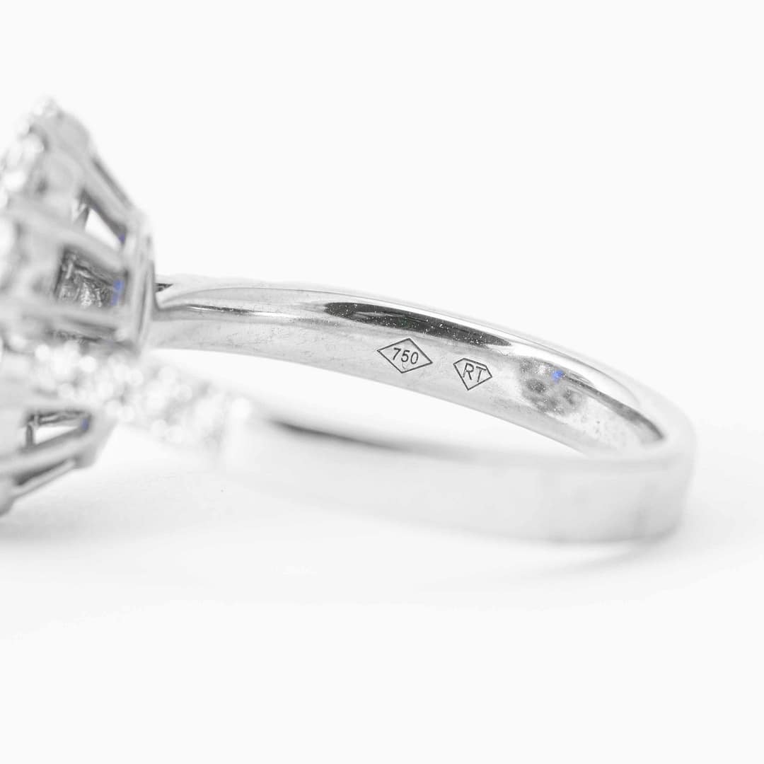 This elegant 18 karat white gold cluster ring features a stunning oval blue sapphire at its center, weighing 2.24 carats. The sapphire is complemented by a halo of 20 meticulously set round diamonds, which have a combined total weight of 1.05 carats. The diamonds serve to amplify the deep blue hue of the sapphire, creating a breathtaking contrast. Sized at 6.5, this ring is not only visually captivating but also exquisitely crafted. To fully appreciate the artistry and quality of this unique piece, we invite you to visit our Shreve, Crump & Low store.