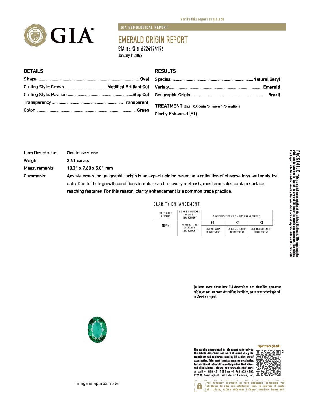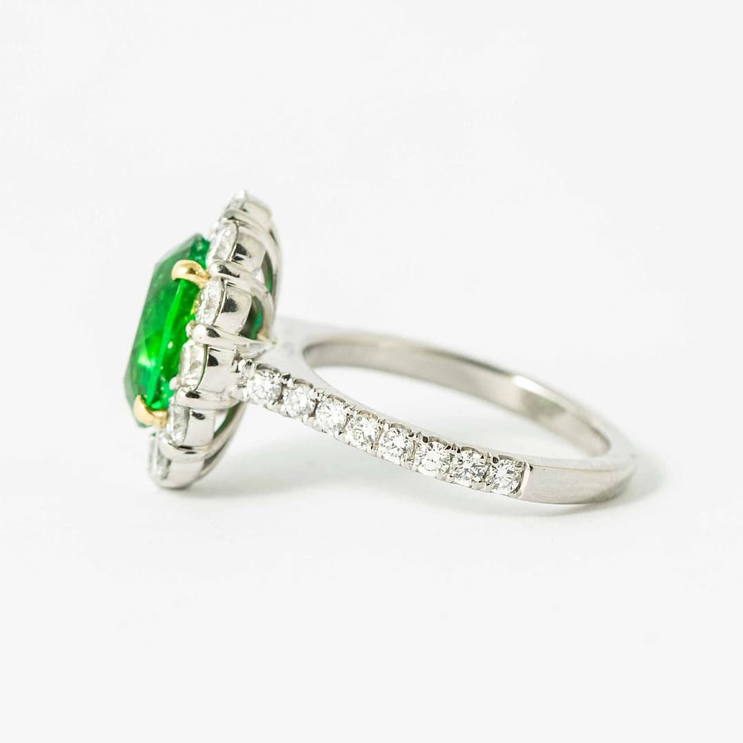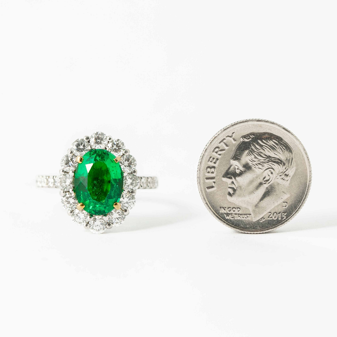 A bespoke Shreve, Crump & Low 18 karat white ring cluster consisting of one oval shape brazil emerald weighing a total of 2.41 carats set with 28 round diamonds on halo and halfway down shank weighing a total of approximately 1.68 carats. Ring size 6. 2.41 carat Emerald accompanied by GIA Certificate no. 6224194196