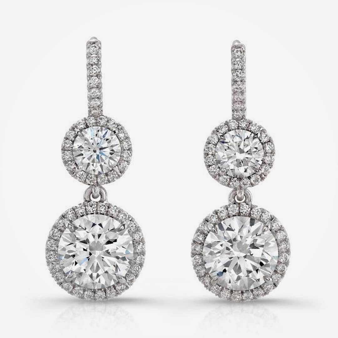 18 Karat white gold drop earrings set with 2 tiers of round brilliant cut diamonds. The top tier is comprised of two .20 and .22 carat diamonds with a color of H and a clarity of VS2. The bottom tier is comprised of a 1.06 carat diamond with a color of I and a clarity of SI1 and a 1.01 carat diamond wit a color of H and a clarity of SI1. All of the diamonds are surrounded in a halo comprised of 94 round brilliant cut diamonds with a total weight of .40 carats.