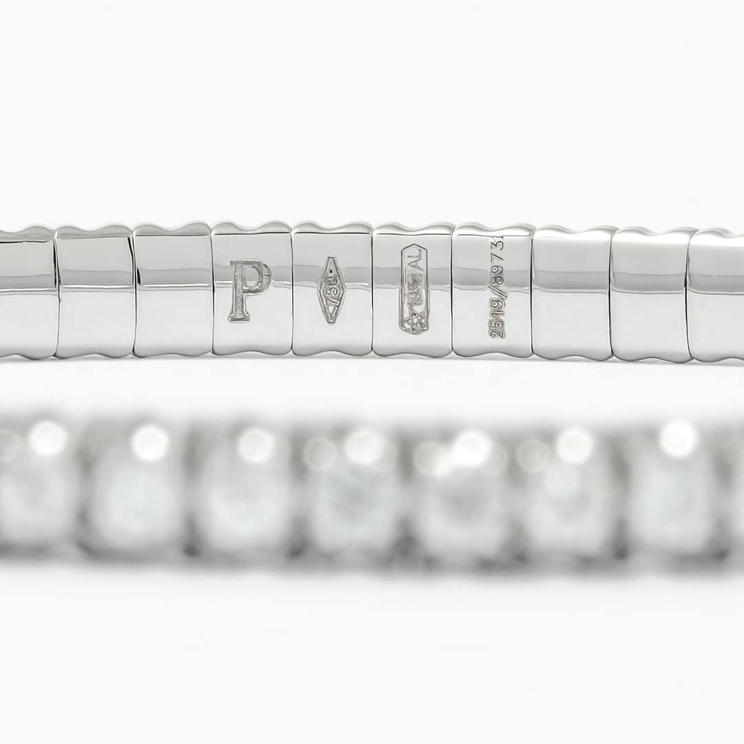 18 karat white gold xpandable tennis bracelet consisting of 80 round diamonds weighing a total of 2.76 carats with color and clarity of F-G/VS respectively. By Picchiotti.