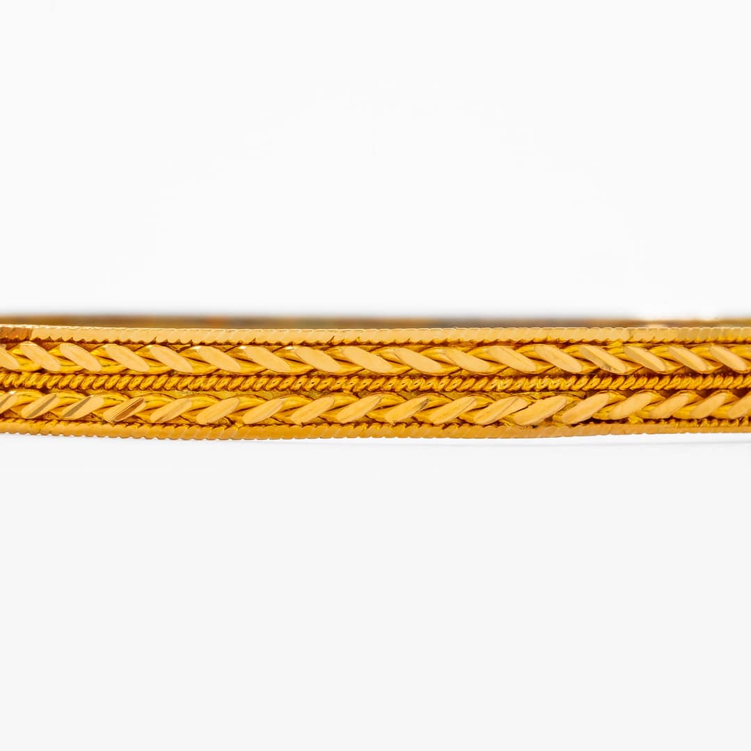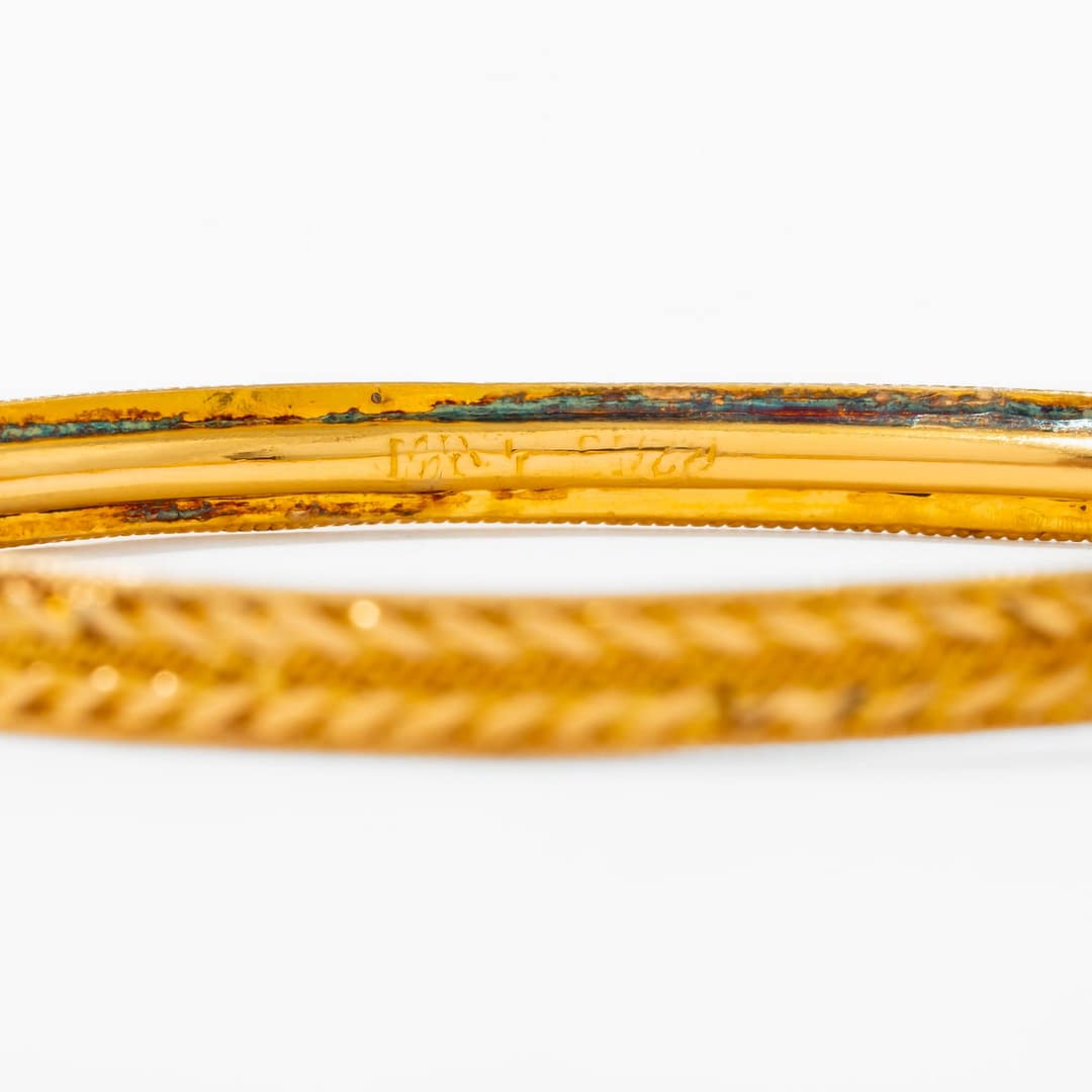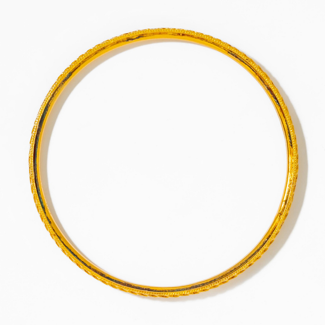 Crafted in 22 karat yellow gold, this 5mm bangle bracelet features intricate engraved accents that add depth and character to its classic design. The wider band provides a statement-making effect while maintaining an elegant, understated look. This bangle’s artisanal details make it perfect for wearing solo or stacking with other bracelets. The piece combines traditional elegance with a touch of intricate beauty, perfect for any occasion.