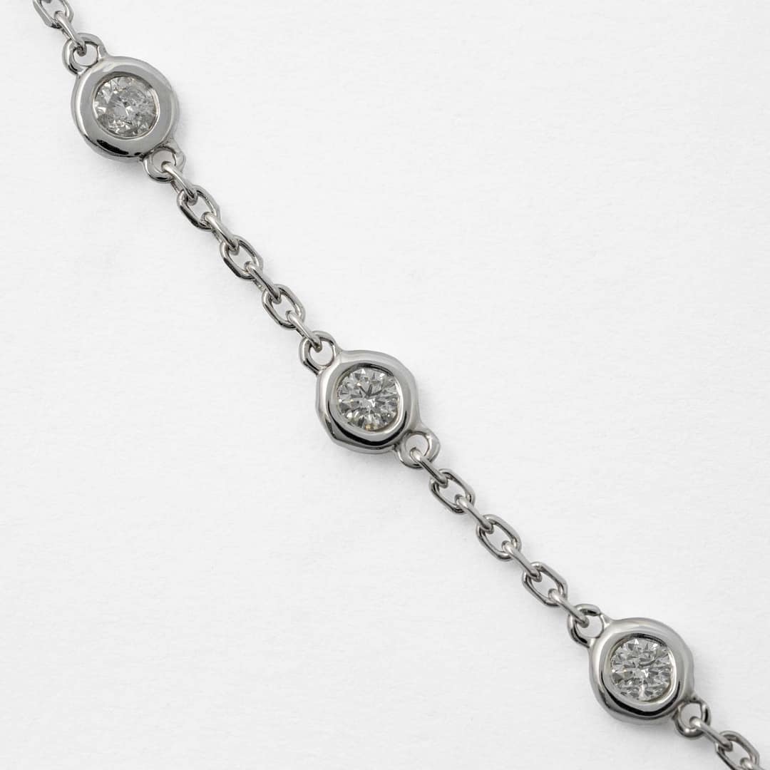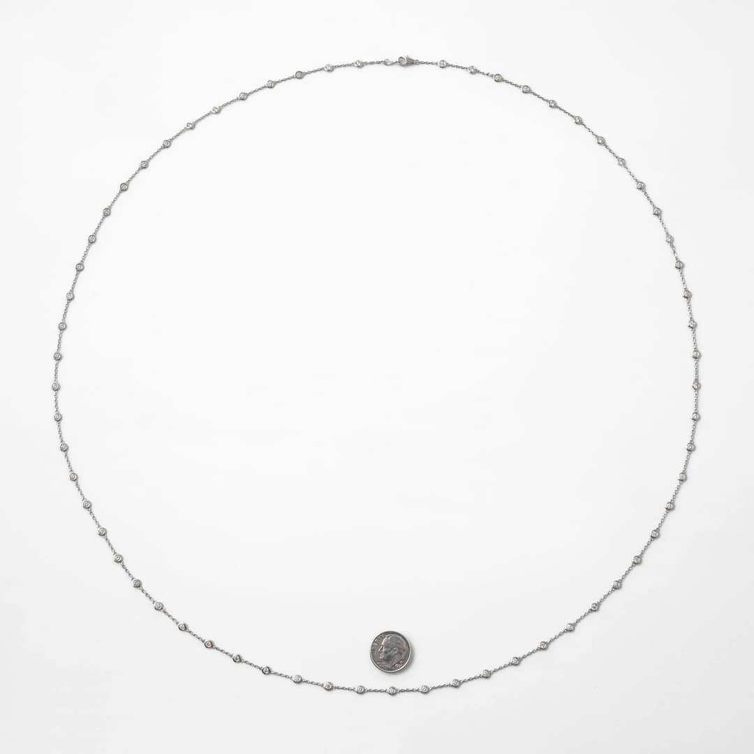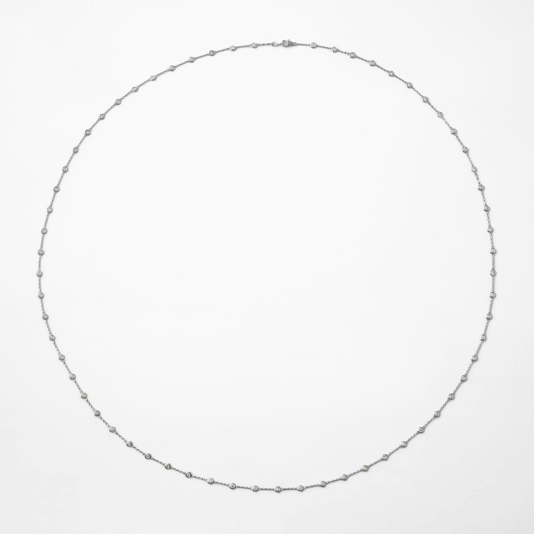Introducing our elegant 14-karat White Gold Diamond by the Yard Necklace, measuring approximately 35 inches in length. This exquisite piece features 3.01 carats of Round Brilliant Cut Diamonds, expertly bezel set for a sophisticated and timeless look. Experience the unmatched beauty and versatility of this stunning diamond necklace, exclusively available at Shreve, Crump & Low.