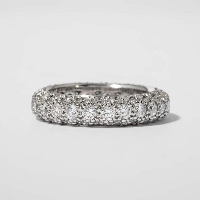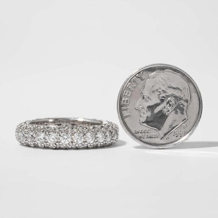 Platinum and Diamond pave band, consisting of 75 round brilliant cut diamond having a total carat weight of 3.16, and color and clarity of F/G VS2. 5mm wide stocked in ring size 5.5.