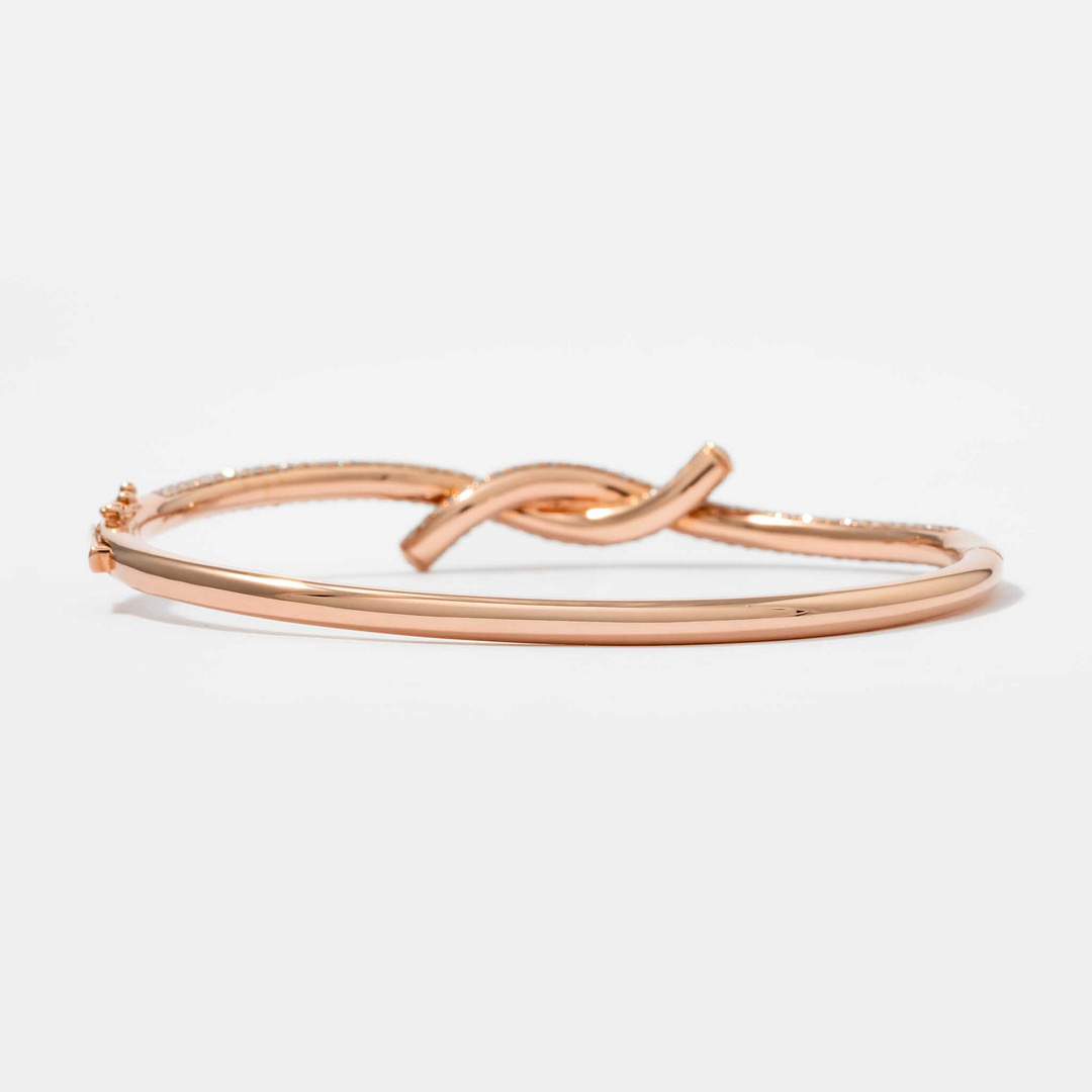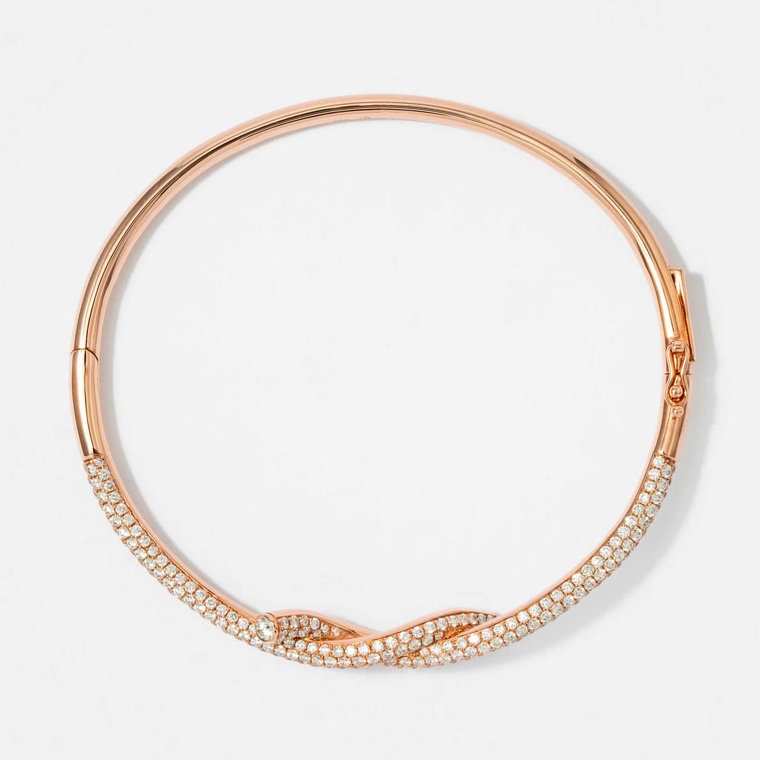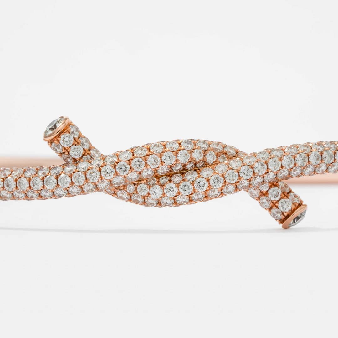 Symbolizing unity and timeless elegance, this 18K rose gold Diamond Knot Bracelet is adorned with 3.26 carats of brilliant diamonds. The intricate knot design is accentuated by the shimmering diamonds, adding a touch of sophistication to its graceful form. Crafted with precision, this bracelet seamlessly blends bold structure with refined sparkle. A meaningful and luxurious statement, it makes a perfect gift or personal treasure.