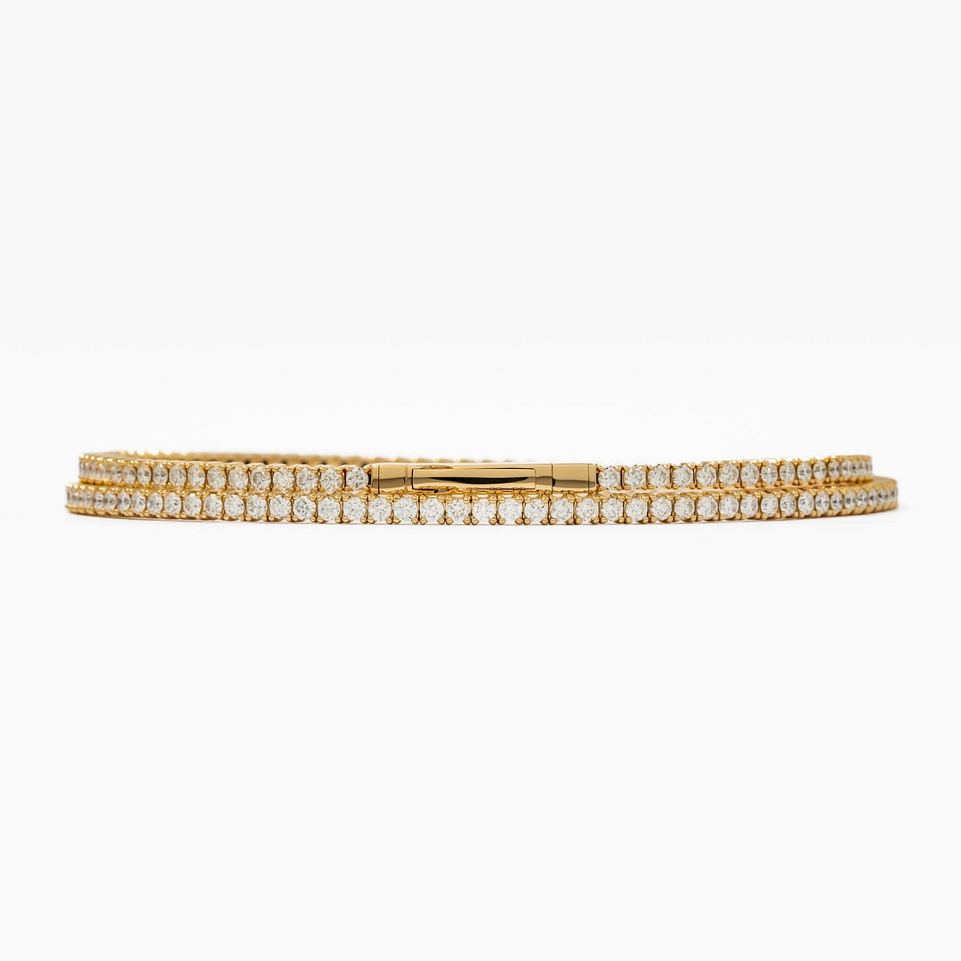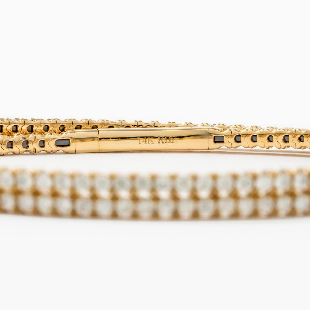 Embrace bold elegance with this 14 karat yellow gold tennis-style wrap-around bracelet, adorned with 3.30 carats of round diamonds. The wrap design offers a striking twist on a classic style, allowing the diamonds to shimmer from every angle. Each stone is meticulously set to enhance the bracelet’s flowing form and brilliance. This statement piece is perfect for those seeking both luxury and contemporary flair.