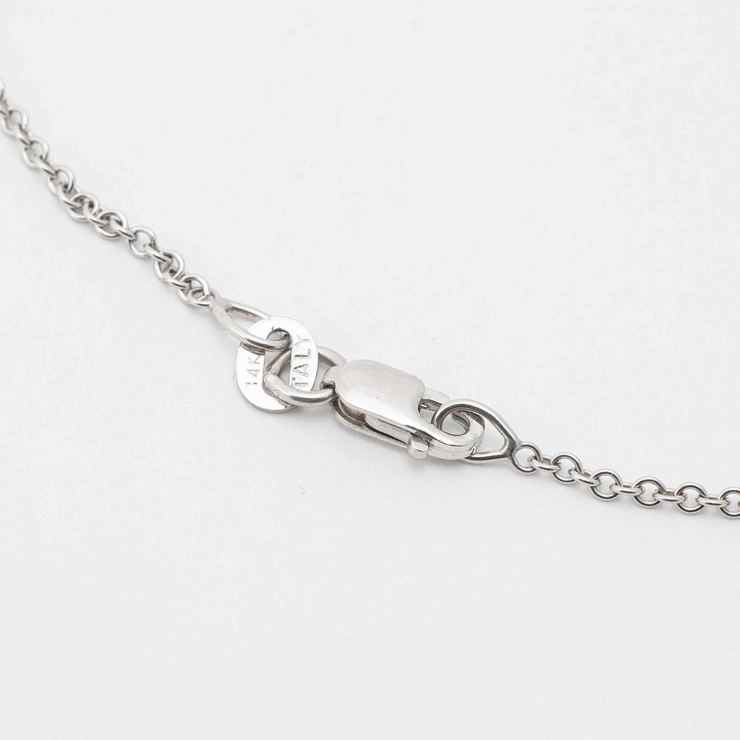This elegant pendant features a 3.38 carat pear-shaped spessartite, known for its vibrant and rich orange hue. The spessartite is beautifully accented by a halo and bail set with thirty-one round brilliant cut diamonds, weighing a total of 0.33 carats with color grades of F-G and clarity of VS. The diamonds enhance the pendant’s brilliance, creating a stunning and eye-catching effect. The pendant is crafted in 14 karat white gold and includes a matching chain, making it ready to wear for any occasion. This piece is perfect for those who appreciate unique gemstones paired with classic diamond elegance.