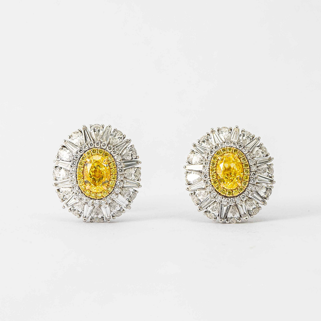 These luxurious 18 karat white and yellow gold cluster earrings are a showstopper, featuring two oval yellow diamonds at the center that weigh a combined 1.41 carats. The yellow diamonds are elegantly framed by two concentric rows of round yellow and white diamonds, adding an additional .44 carats to the design. Further enhancing the glamour, pear-shaped and trapezoid diamonds weighing a total of 2.08 carats complete the setting, creating a multifaceted sparkle from every angle. The combination of different diamond shapes and colors offers a rich tapestry of light and brilliance. These earrings are a dazzling embodiment of exceptional craftsmanship and timeless elegance. To fully experience their radiance, we invite you to visit our Shreve, Crump & Low store.