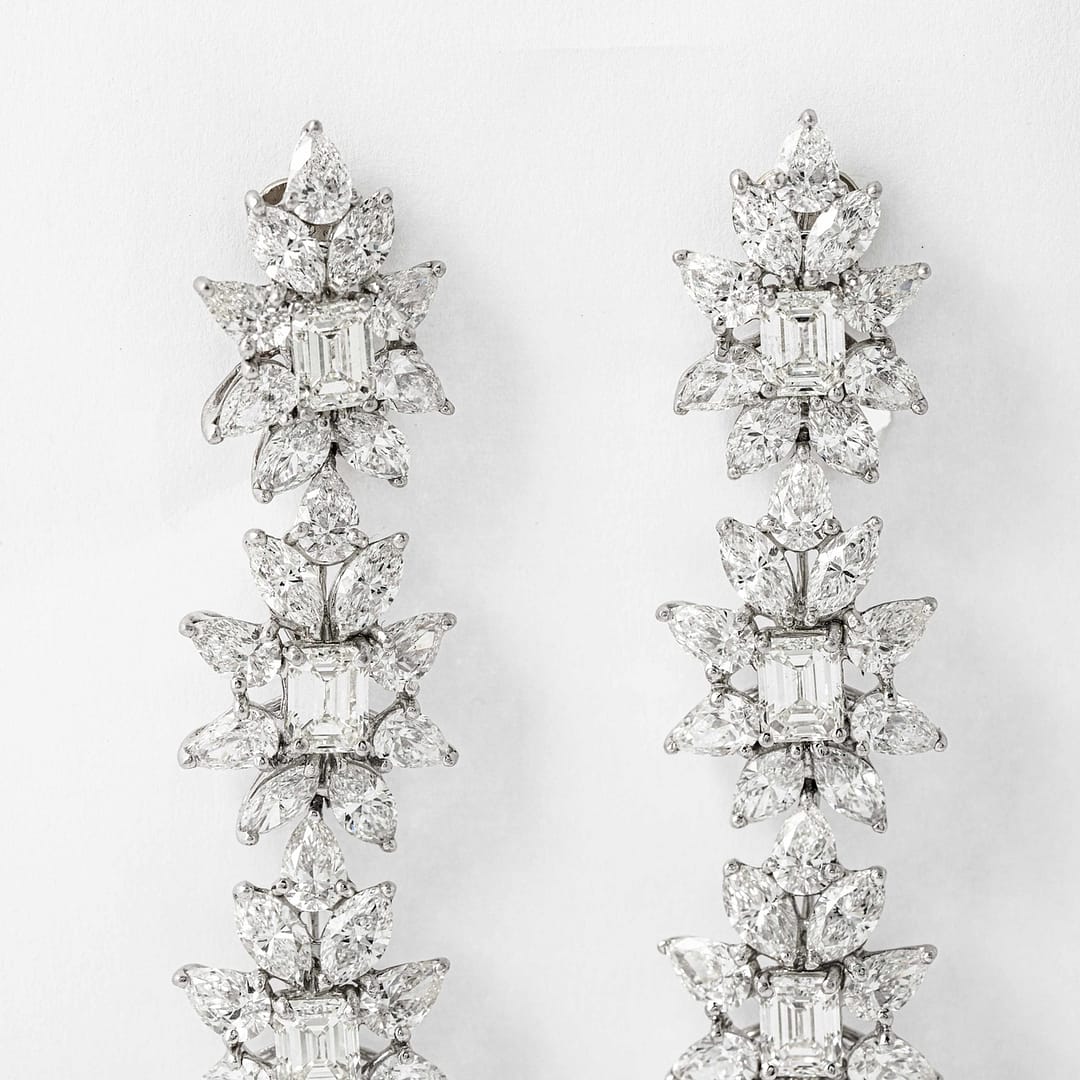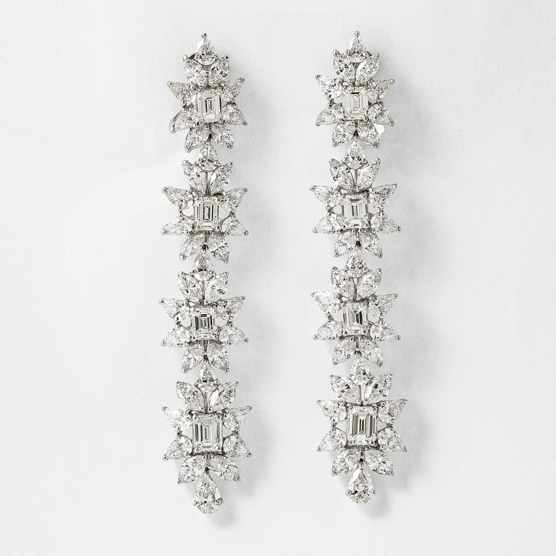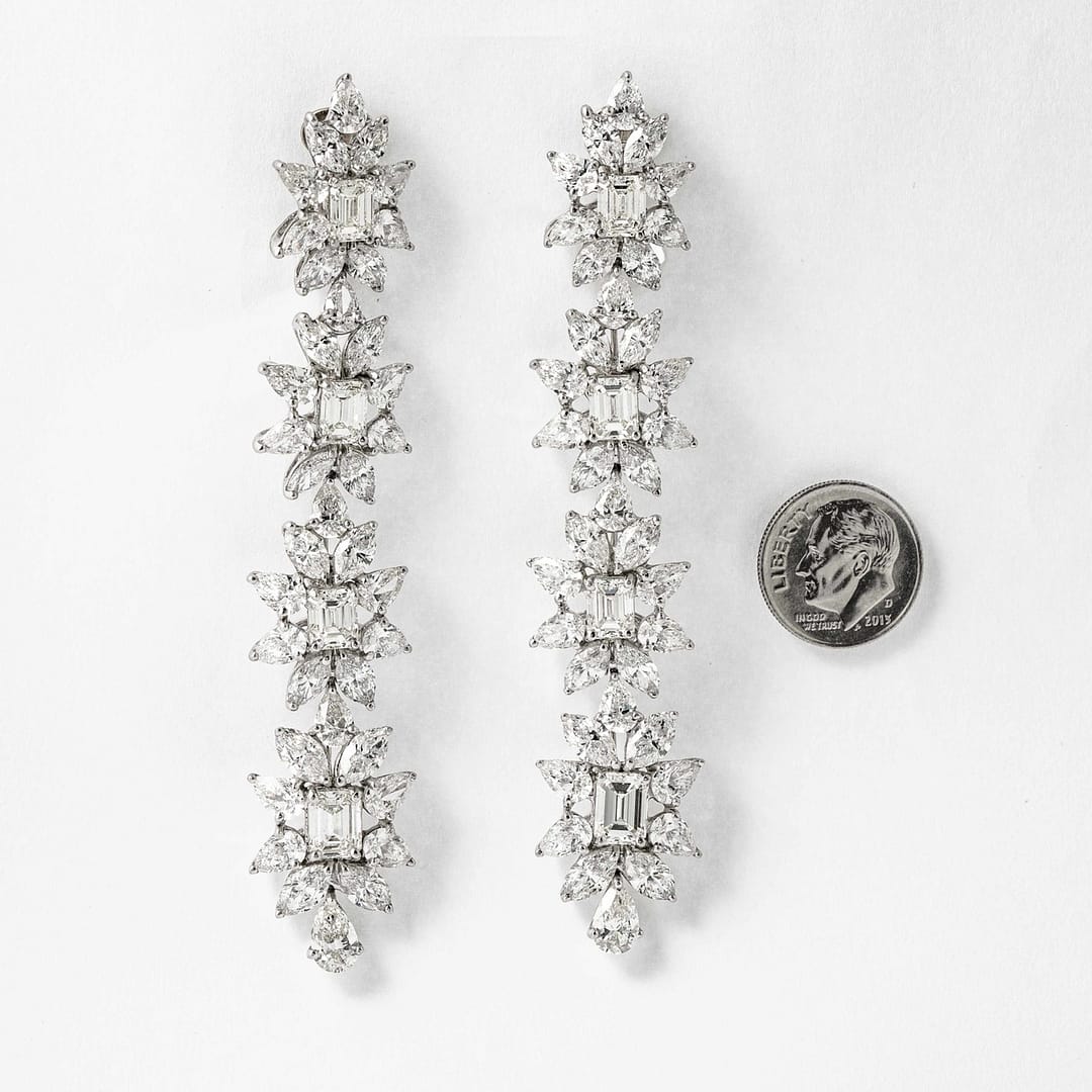 Shreve, Crump & Low is proud to offer this important and impressive 38.50 (approximate) carat fancy flower drop earrings. These earrings consist of four emerald-cut center diamonds surrounded by twenty-one pear-shape and sixteen marquise-cut diamonds. Length= 3.5″ , width = 3/4″.