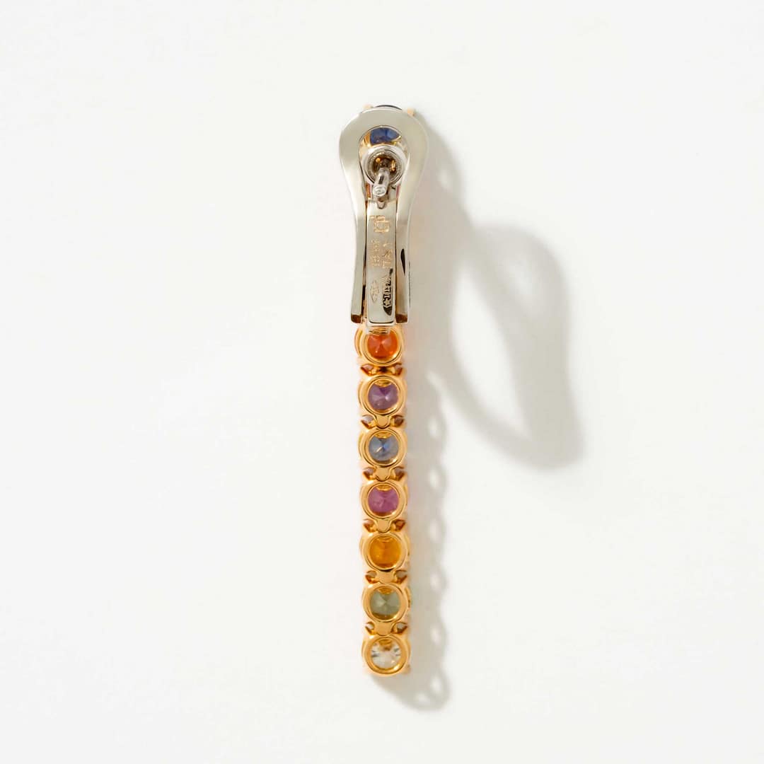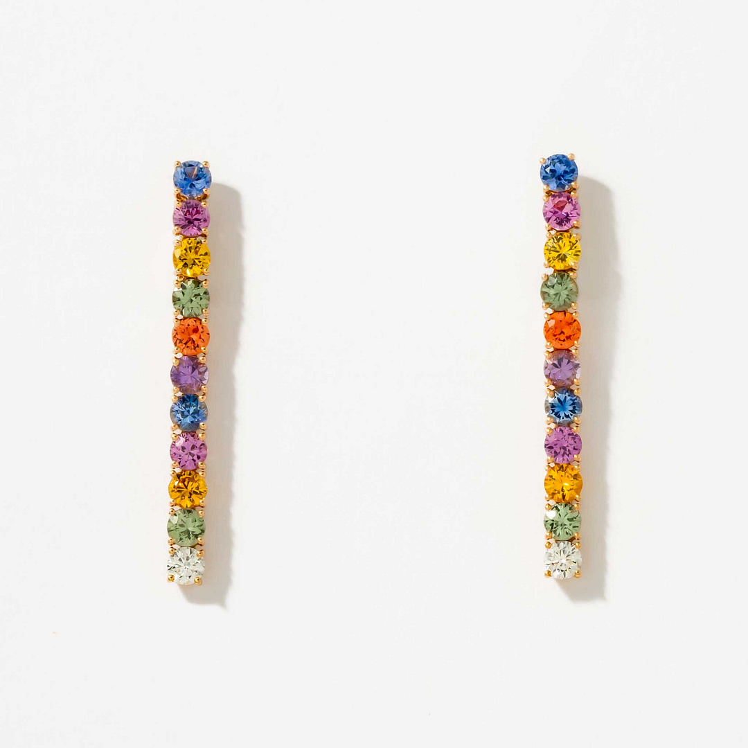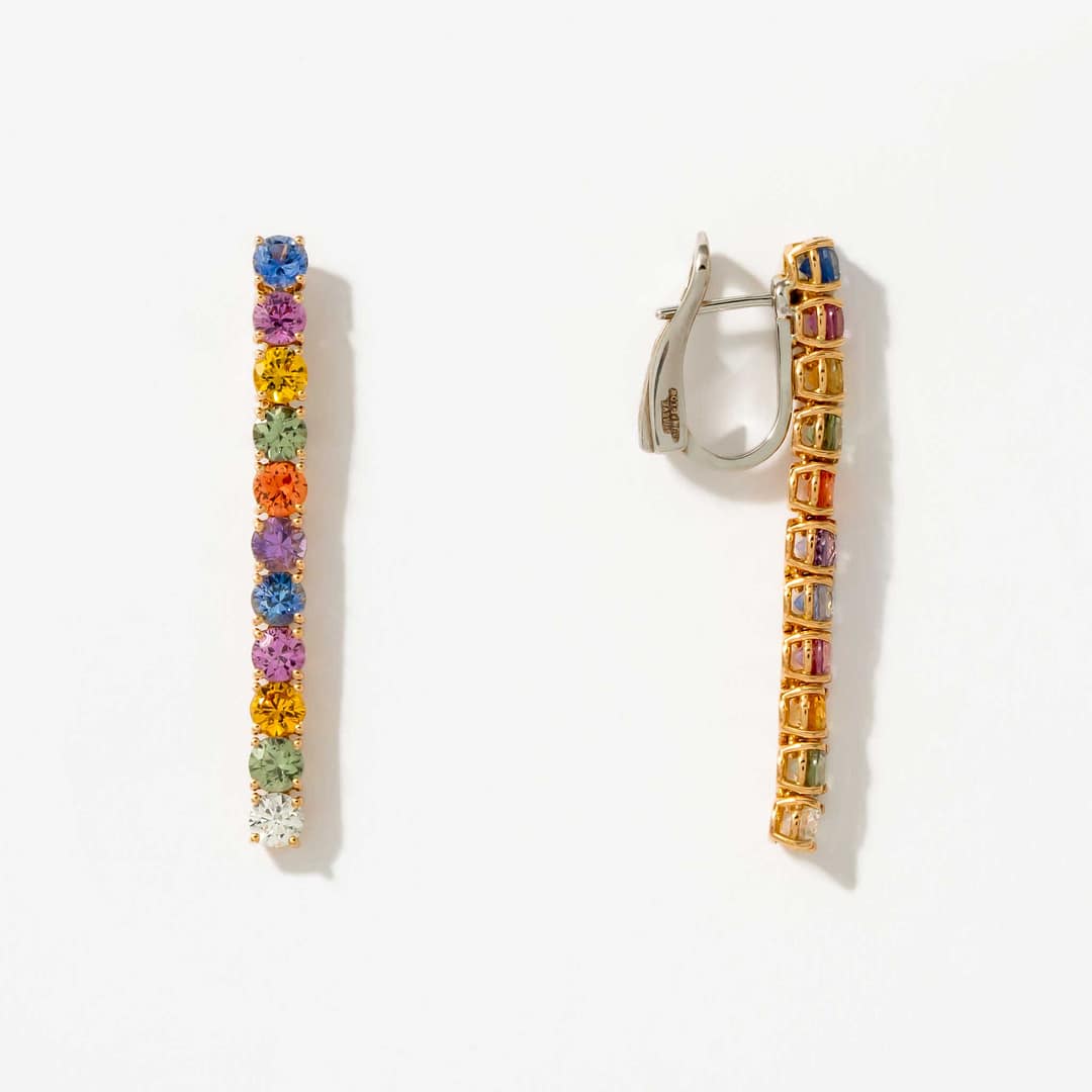 These elegant 18 karat yellow and white gold dangle earrings celebrate color and brilliance with 20 round multi-colored sapphires totaling 4.20 carats, interspersed with 2 round diamonds weighing 0.33 carats. The combination of warm yellow gold and bright white gold accents provides a striking contrast that enhances the sapphires’ vibrant hues. Designed to catch the light with every movement, these earrings bring a playful yet refined touch to any ensemble. Perfect for those who appreciate colorful gemstones in a classic yet dynamic setting.