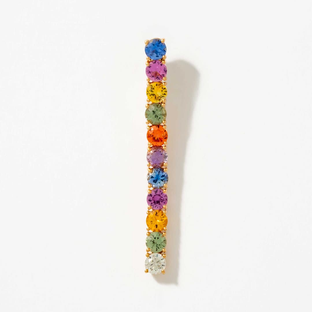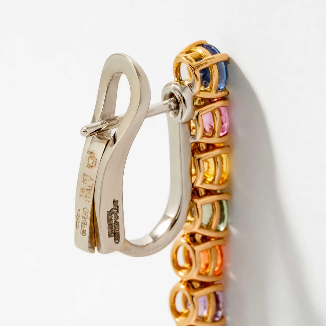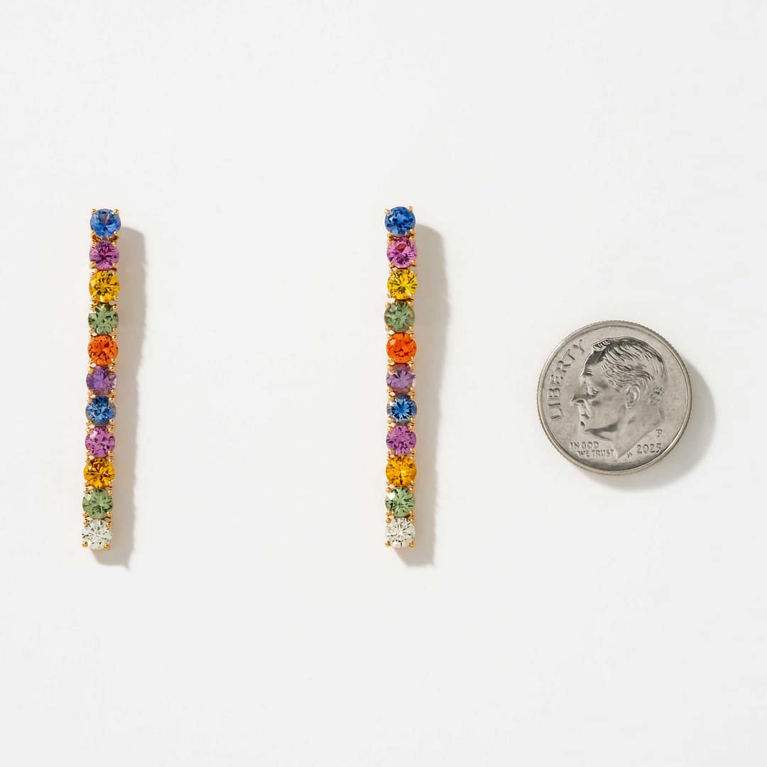 These elegant 18 karat yellow and white gold dangle earrings celebrate color and brilliance with 20 round multi-colored sapphires totaling 4.20 carats, interspersed with 2 round diamonds weighing 0.33 carats. The combination of warm yellow gold and bright white gold accents provides a striking contrast that enhances the sapphires’ vibrant hues. Designed to catch the light with every movement, these earrings bring a playful yet refined touch to any ensemble. Perfect for those who appreciate colorful gemstones in a classic yet dynamic setting.