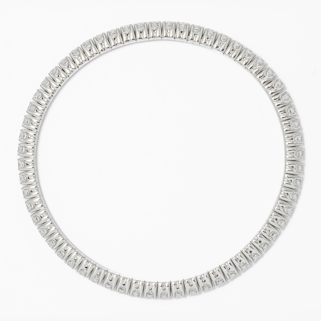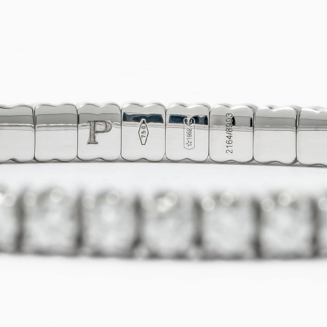 18 karat white gold xpandable bracelet by Picchiotti consisting of 60 round brilliant cut diamonds weighing a total of 5.01 carats with color and clarity of F-G/VS respectively.