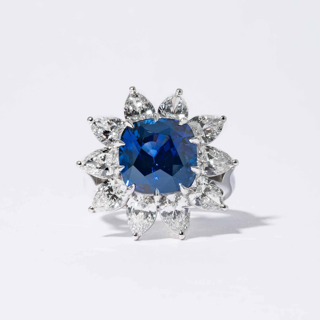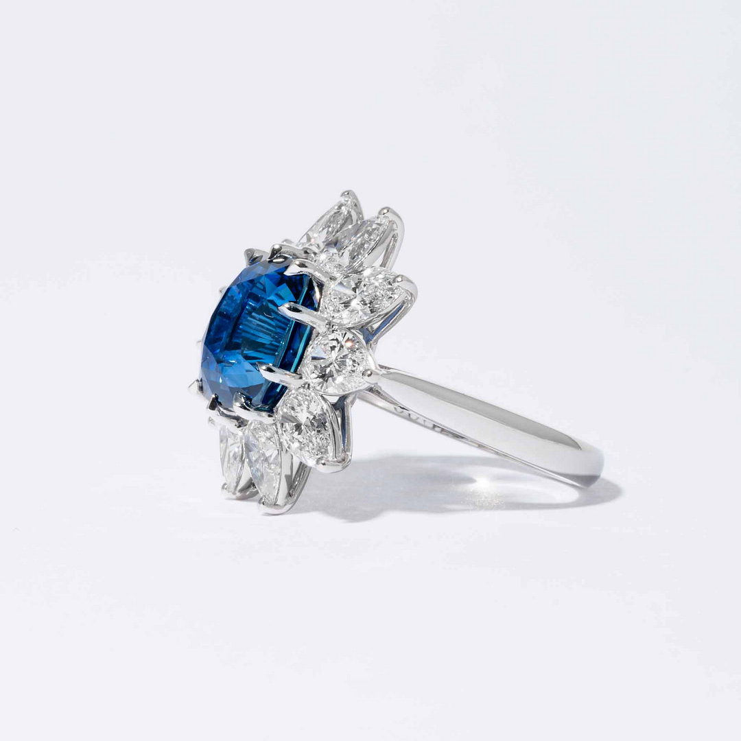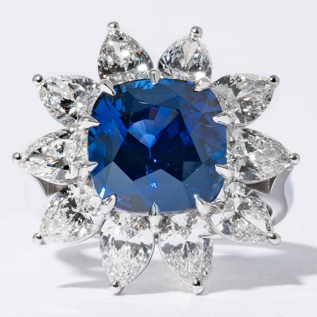 Platinum cluster ring consisting of one cushion cut Madagascar Sapphire weighing a total of 7.00 carat GIA Certification #1182773566. The sapphire is surrounded by ten pear shaped diamonds weighing a total of 3.24 carats total.
