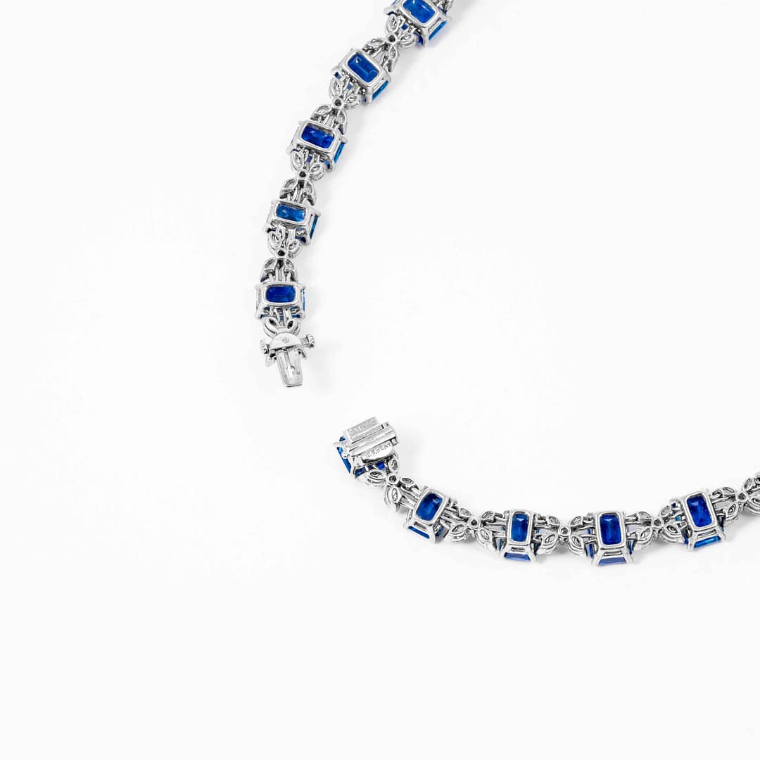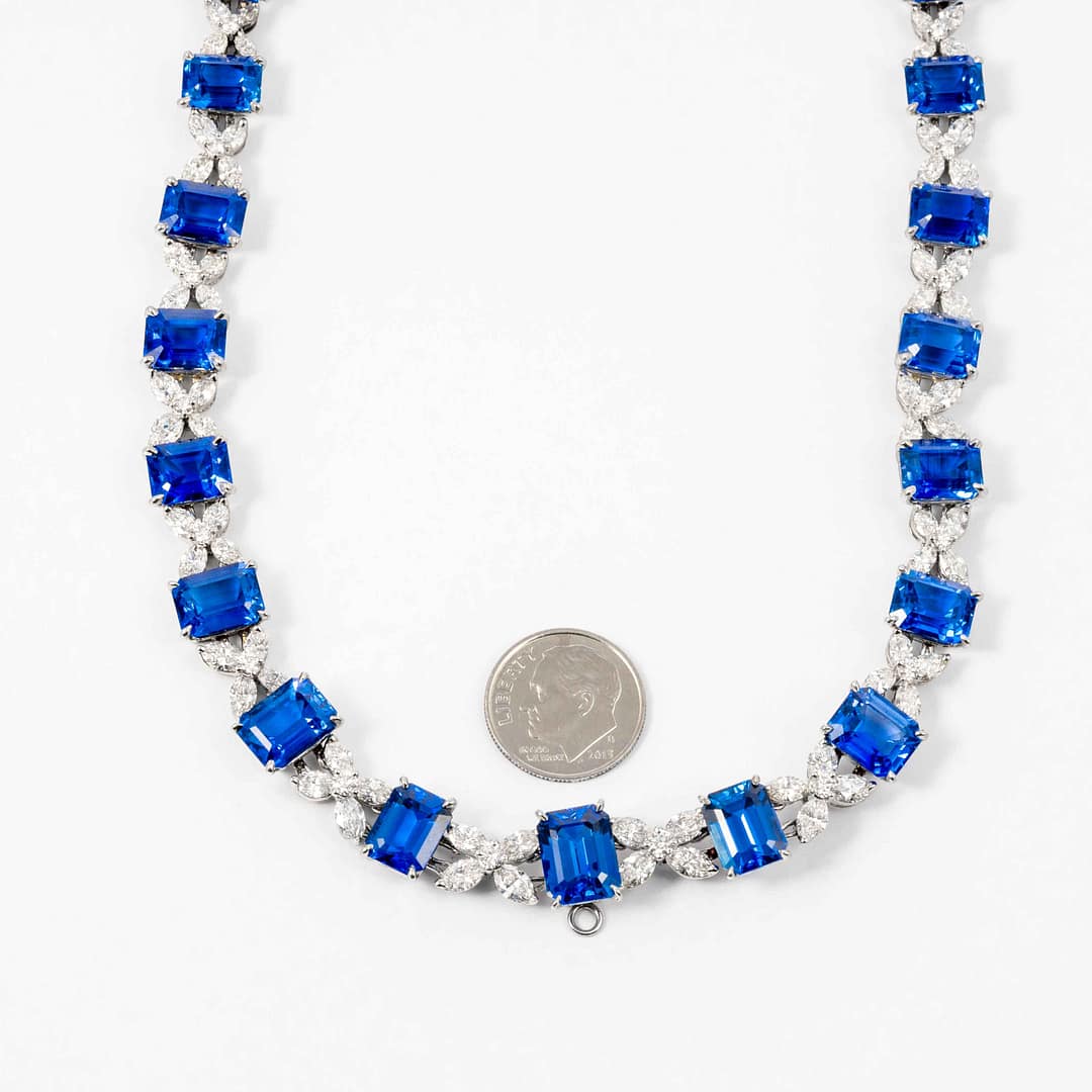 Platinum choker necklace by Oscar Heyman consisting of 85.21 carats of Emerald cut Ceylon Blue Sapphires. Measurements of the sapphires range from 7.76×6.04×4.57mm -10.74×8.12×5.74mm, The Sapphires are separated by an “X” formation of Marquis cut diamonds which have the combine weight of 15.36 carats. Placed in the center of each “X” are Round cut diamonds that have a combined weight of 2.82 carats. The necklace is 16 inches in length and comes accompanied with an AGL certificate # 103403.