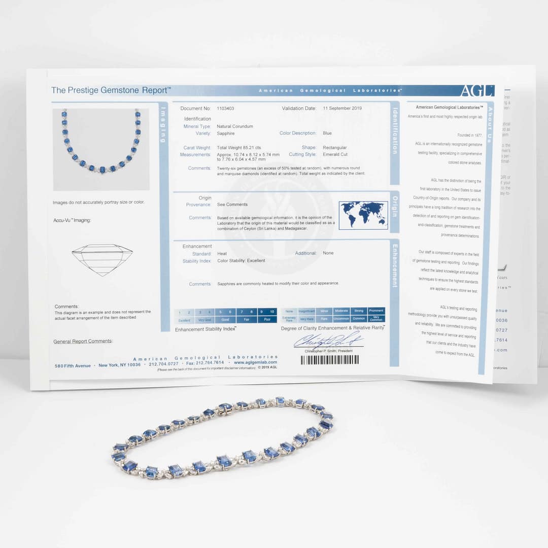 Main Stone Cut: Emerald Cut Ceylon Blue SapphireCenter Stone Color/Clarity: N/AMain Stone Carat Weight: 85.21Side Stones: Marquis Cut & Round Brilliant Diamonds (18.18ct)Mounting Metal: PlatinumCertification: AGL