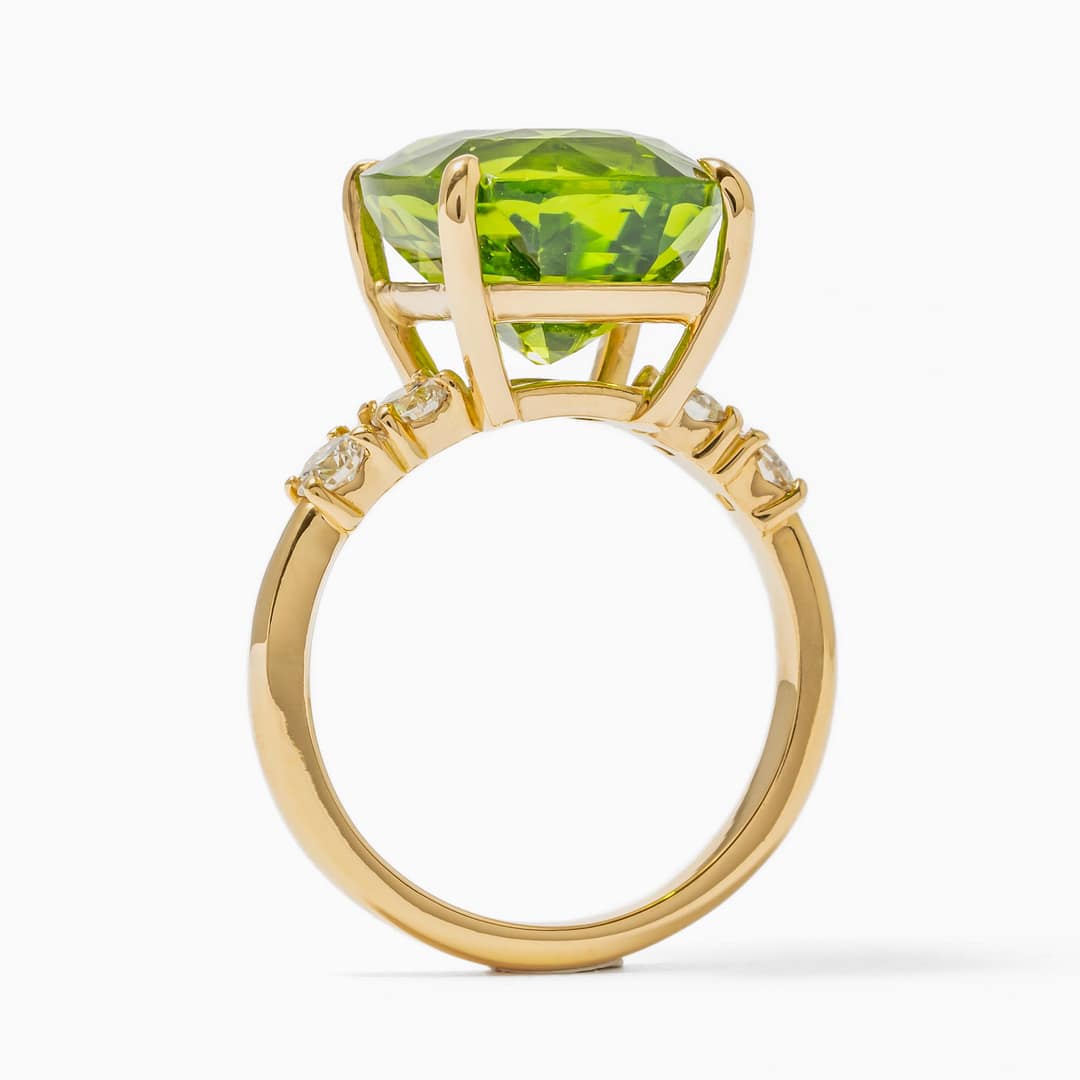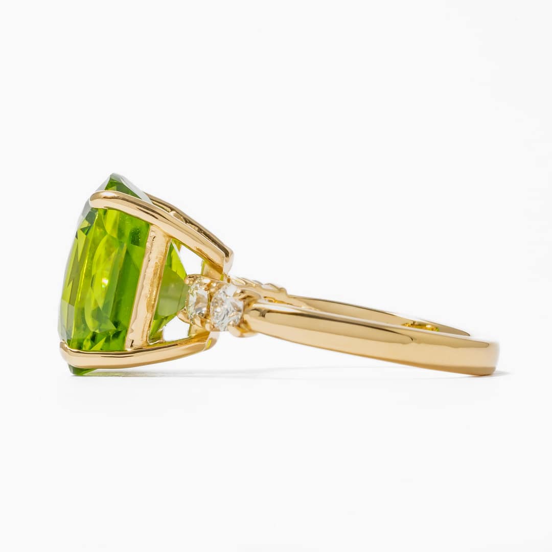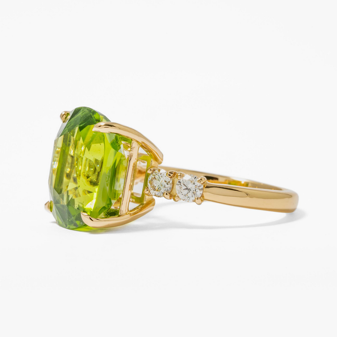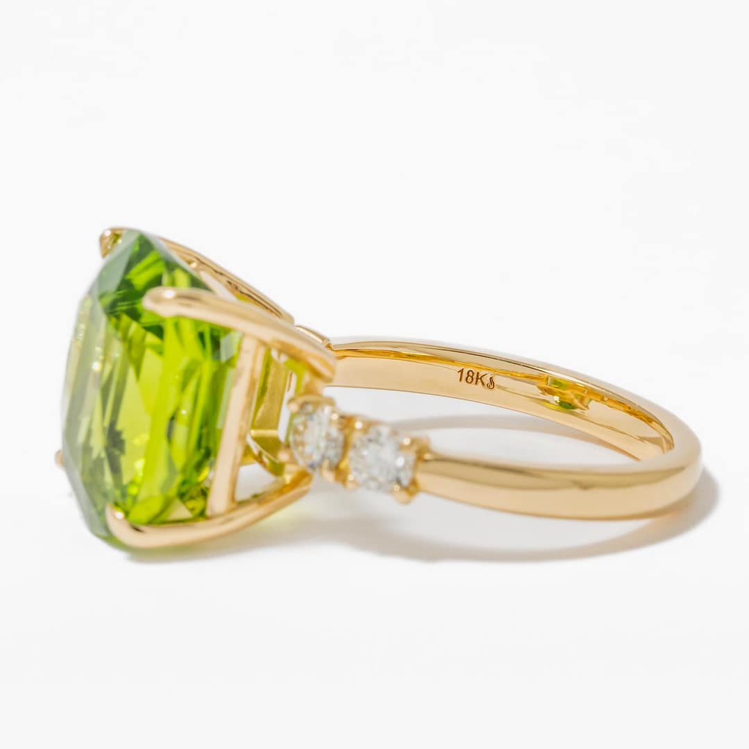 Step into a world of vibrant elegance with our 18 karat yellow gold ring, a piece that captures the essence of refined luxury. At the center of this exquisite ring is a stunning 9.27 carat cushion-shaped peridot, a gemstone renowned for its lush green hue and captivating clarity. This beautiful peridot, with its lively color and impressive size, is a true showstopper, offering a glimpse into the heart of nature’s splendor. Complementing the striking peridot are four round diamonds, collectively weighing 0.44 carats. These diamonds are strategically set to frame the peridot, adding a touch of timeless brilliance and enhancing the ring’s overall allure. Crafted in a size 6.75, the ring’s band, made of rich 18 karat yellow gold, provides a warm and lustrous backdrop that harmoniously ties together the vibrancy of the peridot with the sparkling diamonds. This ring is not just a piece of jewelry; it is a celebration of exquisite taste and a testament to the beauty of fine gemstones.