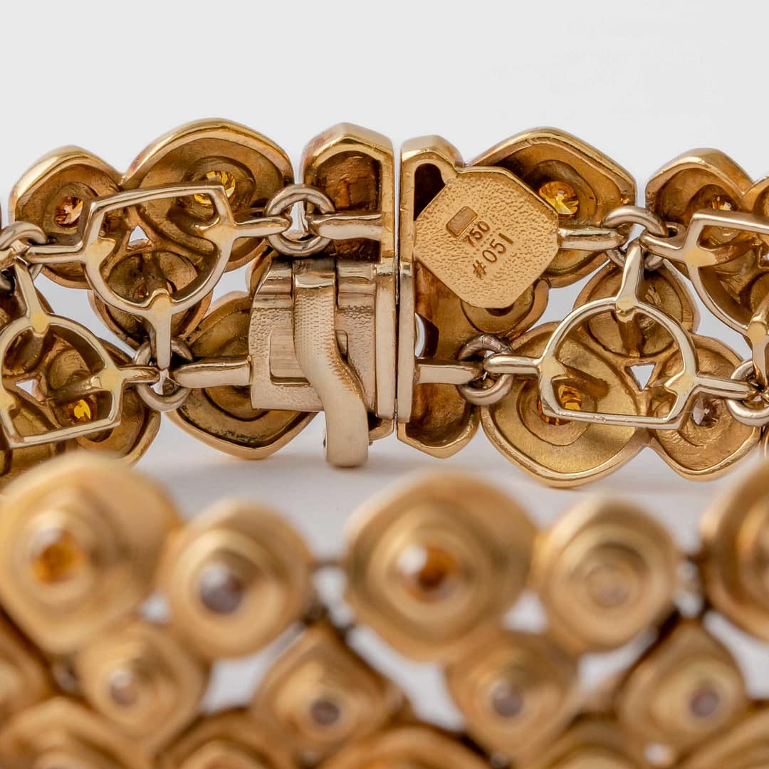 Introducing the Alex Sepkus Yellow Diamond Bracelet, expertly crafted in 18-karat Yellow Gold. This exquisite piece features a stunning triple-row design, measuring 7 inches in length and approximately 1/2 inch in width. Discover unparalleled elegance and sophistication with this luxurious bracelet, exclusively available at Shreve, Crump & Low.