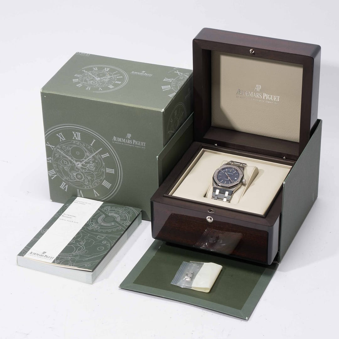 Condition Report: This genuine Audemars Piguet timepiece is in mint condition. This watch is sold with box and no papers, watch is sold “as is” an “as photographed”. This timepiece has been inspected, and tested prior to sale – movement functioning as normal. This AP reference highly sought after rare 39mm stainless steel blue dial Royal Oak. This specific reference is now discontinued, sold out, and unavailable via AP authorized points of sale. The Audemars Piguet Royal Oak 15300 was produced between 2005 and 2012, which aligns with the G serial production years of 2008-2010.