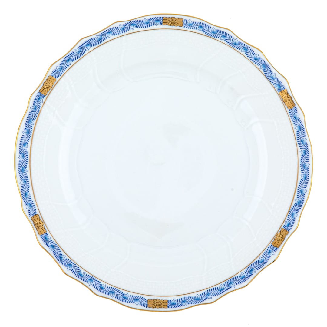 Martin’s Herend fine white porcelain dinner plate with hand painted Chinese Garland in the color blue with 24 karat gold accents and trim.