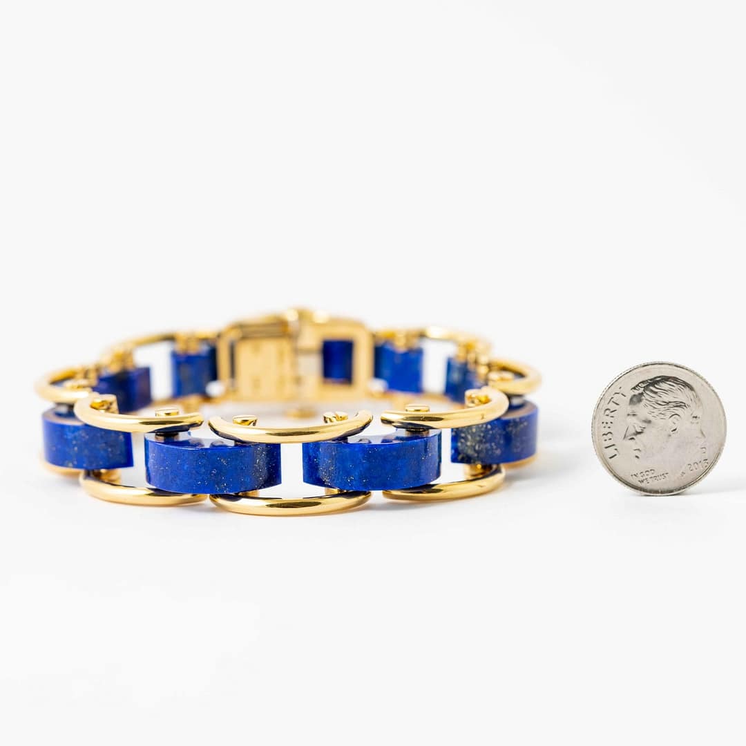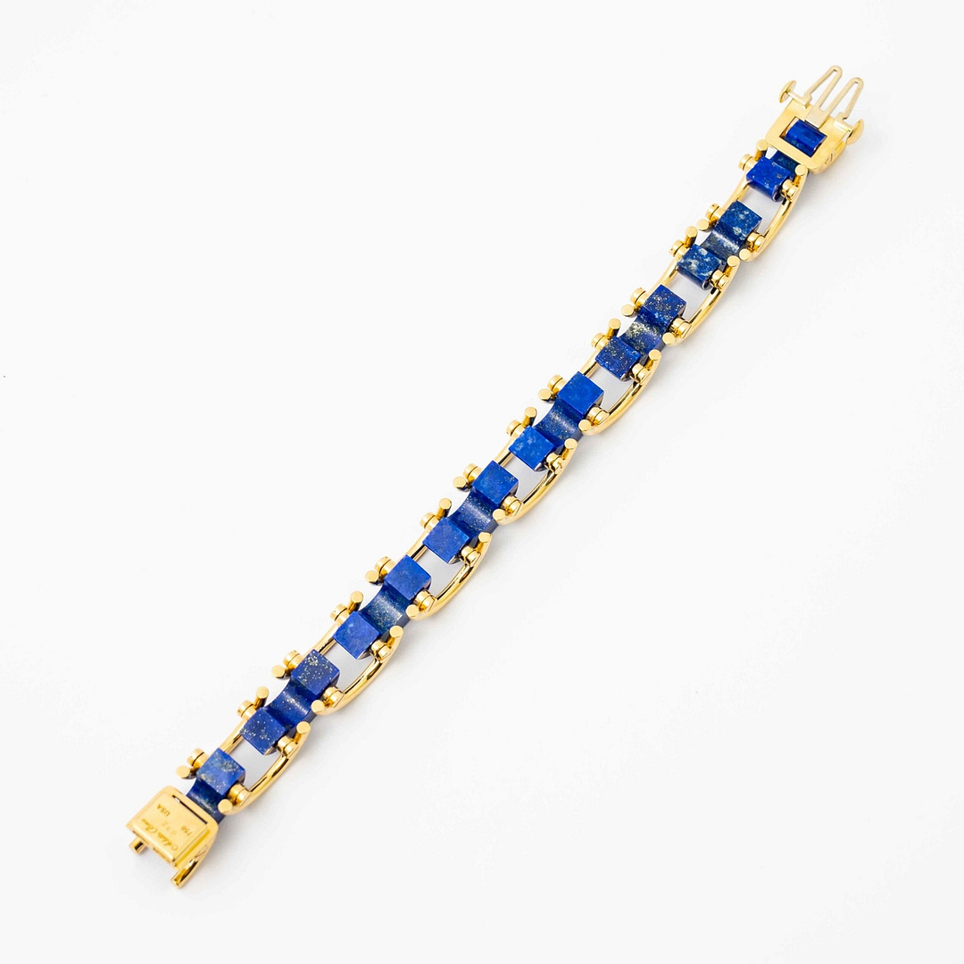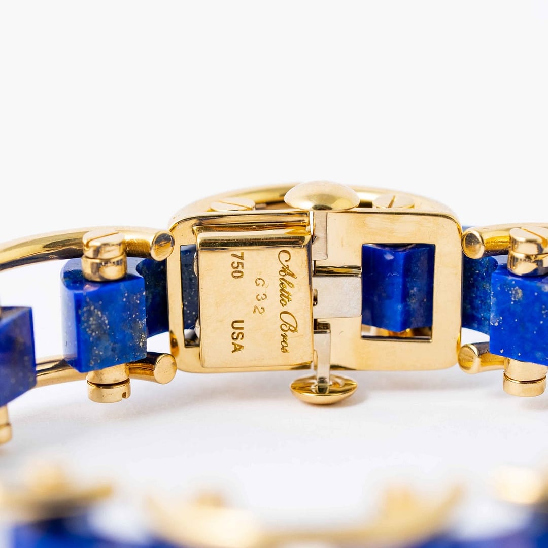 18 karat yellow gold bridge style bracelet consisting of blue lapis accents, approximately 7.50″ long. Signed on bottom of clasp with marker’s hallmark “Aletto Bros”