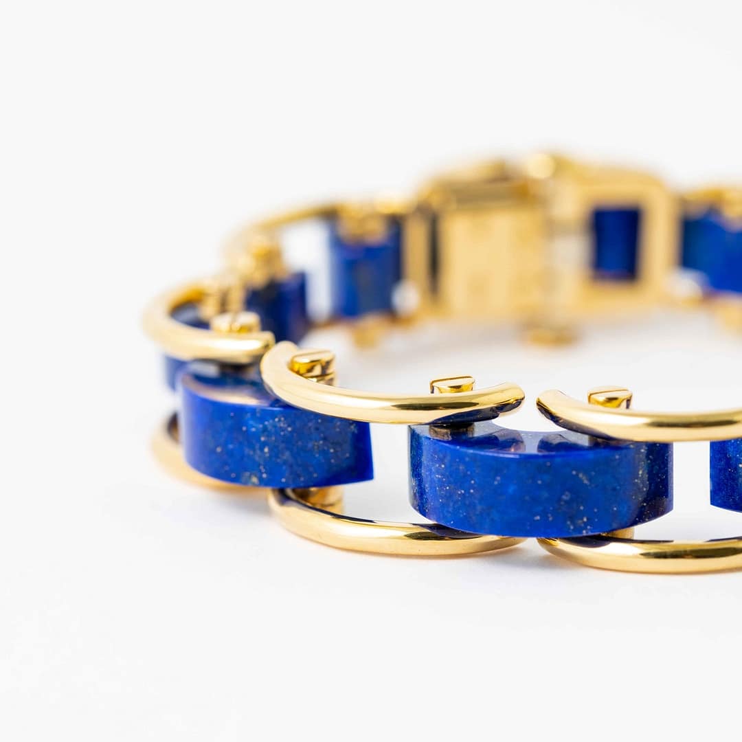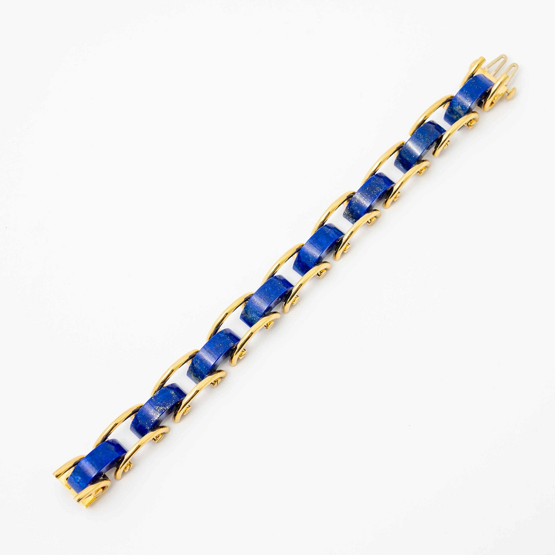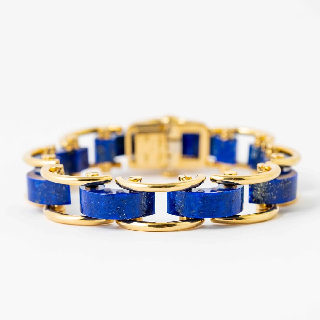 18 karat yellow gold bridge style bracelet consisting of blue lapis accents, approximately 7.50″ long. Signed on bottom of clasp with marker’s hallmark “Aletto Bros”