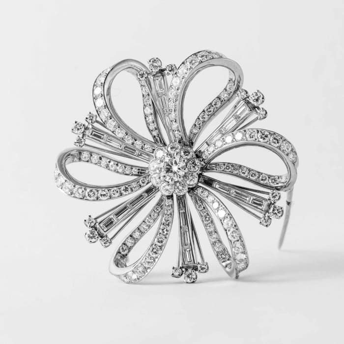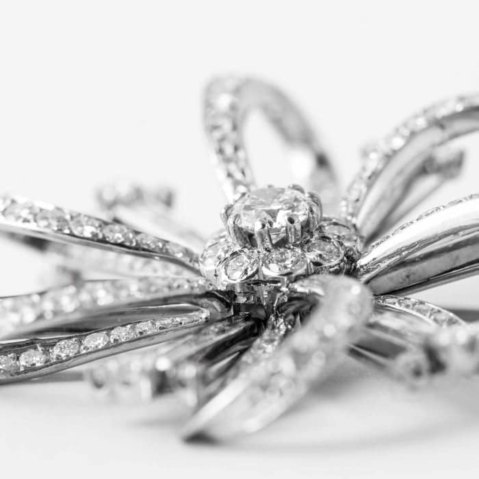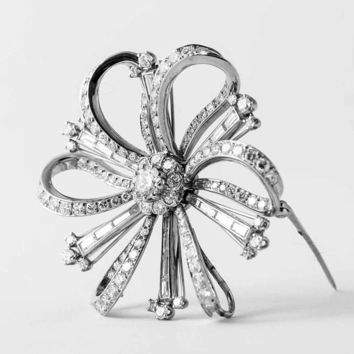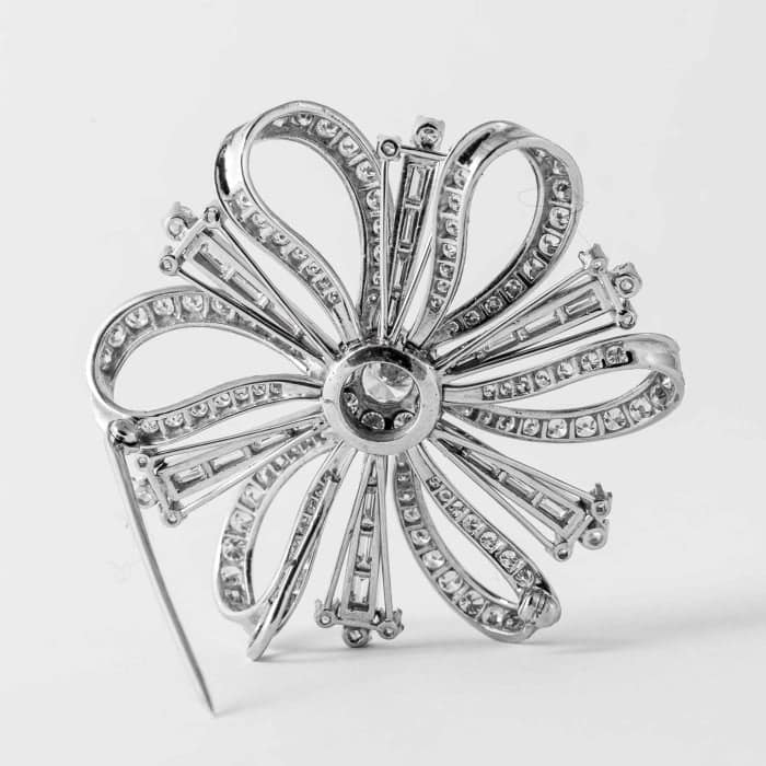 Platinum estate floral motif pin / pendant consisting of approximately 7.25 carats total weight of round brilliant cut and baguette diamonds.